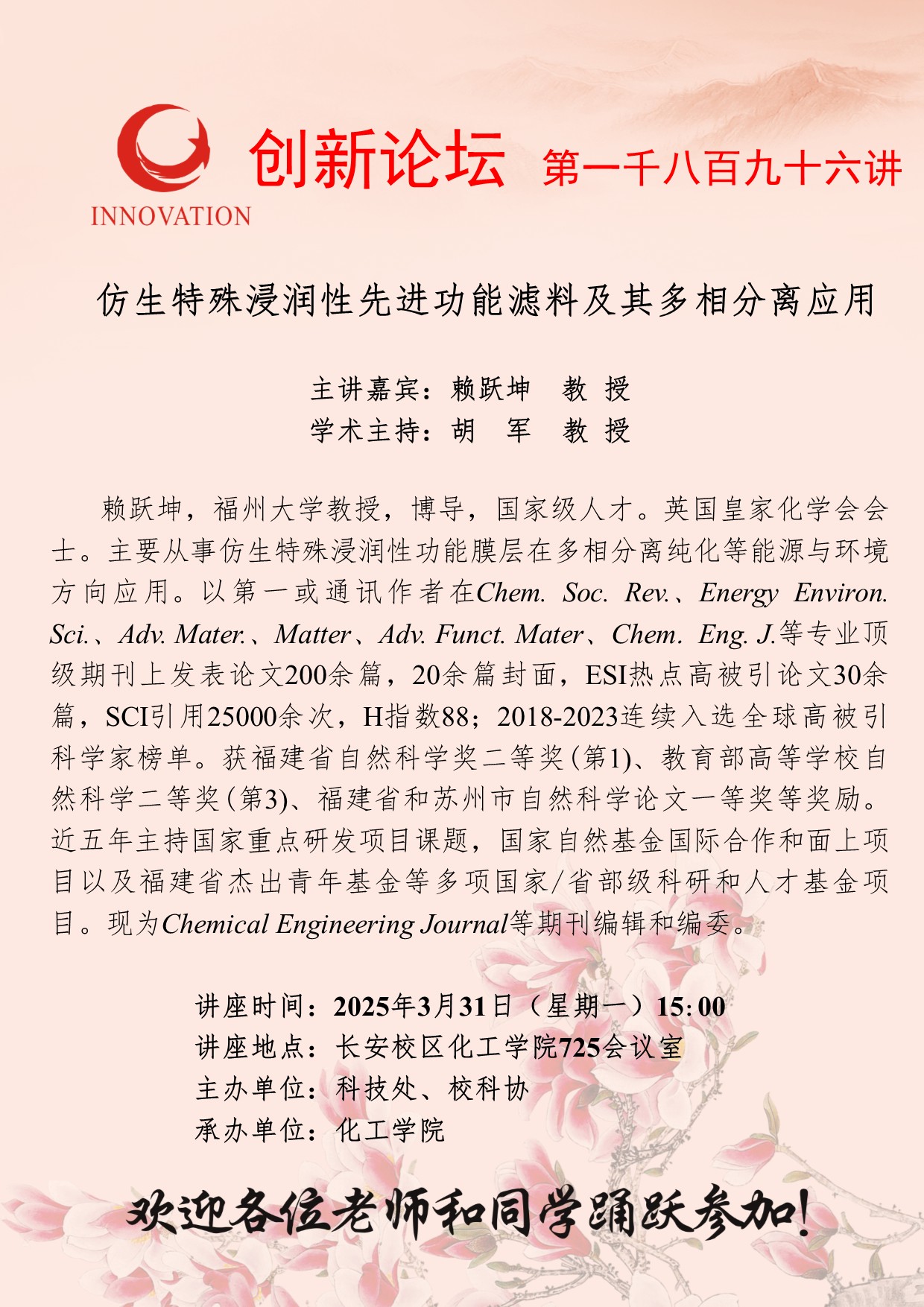 赖跃坤 教授 星空app官网创新论坛第一千八百九十六讲:仿生特殊浸润性先进功能滤料及其多相分离应用 讲座时间 2025年3月31日(星期一)15:00 讲座地点 长安校区化工学院725会议室 讲座人介绍 赖跃坤 教授 讲座内容