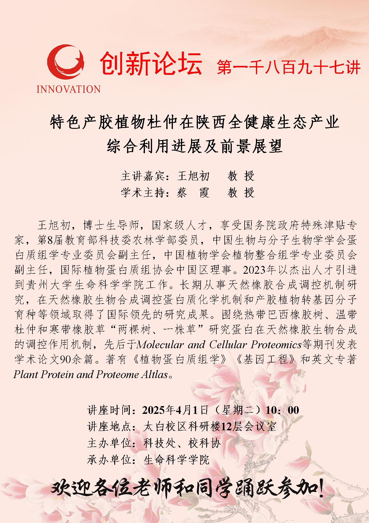 王旭初 教授 星空app官网创新论坛第一千八百九十七讲:特色产胶植物杜仲在陕西全健康生态产业综合利用进展及前景展望 讲座时间 2025年4月1日(星期二)10:00 讲座地点 太白校区科研楼12层会议室 讲座人介绍 王旭初 教授 讲座内容