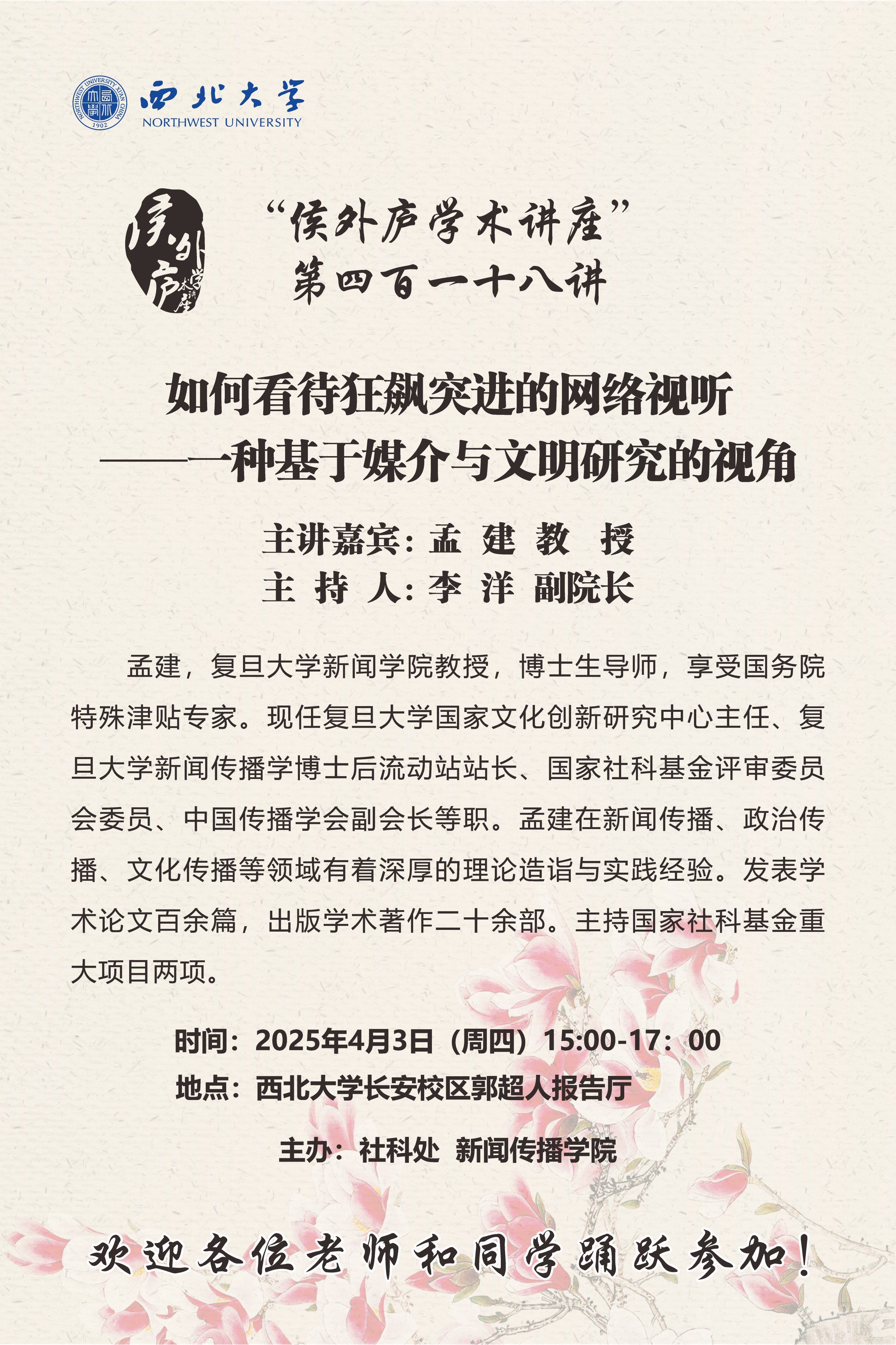 孟建 教授 “侯外庐学术讲座”第四百一十八讲:如何看待狂飙突进的网络视听——一种基于媒介与文明研究的视角 讲座时间 2025年4月3日(周四)15:00-17:00 讲座地点 星空app官网长安校区郭超人报告厅 讲座人介绍 孟建 教授 讲座内容