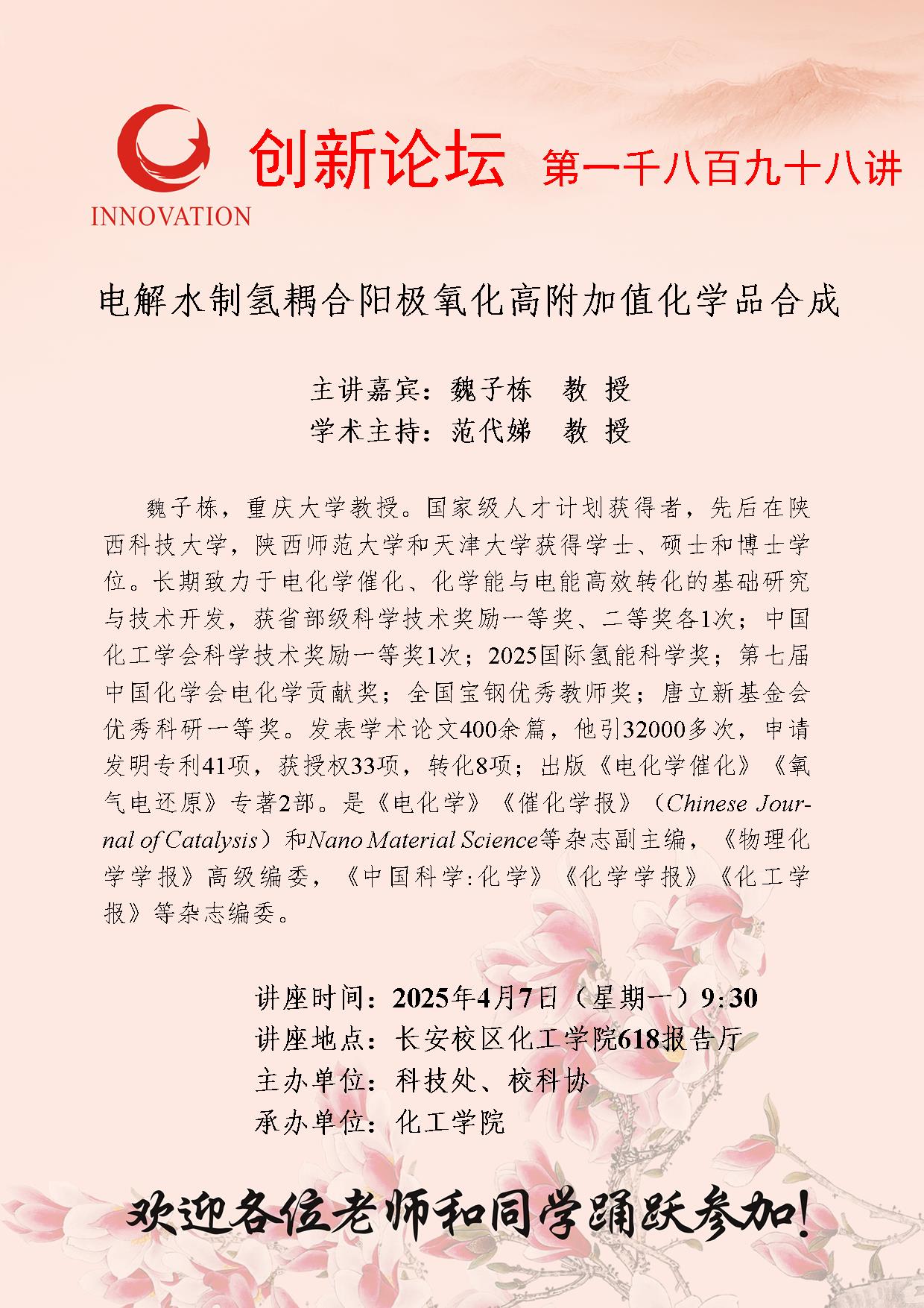 魏子栋 教授 星空app官网创新论坛第一千八百九十八讲:电解水制氢耦合阳极氧化高附加值化学品合成 讲座时间 2025年4月7日(星期一)9:30 讲座地点 长安校区化工学院618报告厅 讲座人介绍 魏子栋 教授 讲座内容