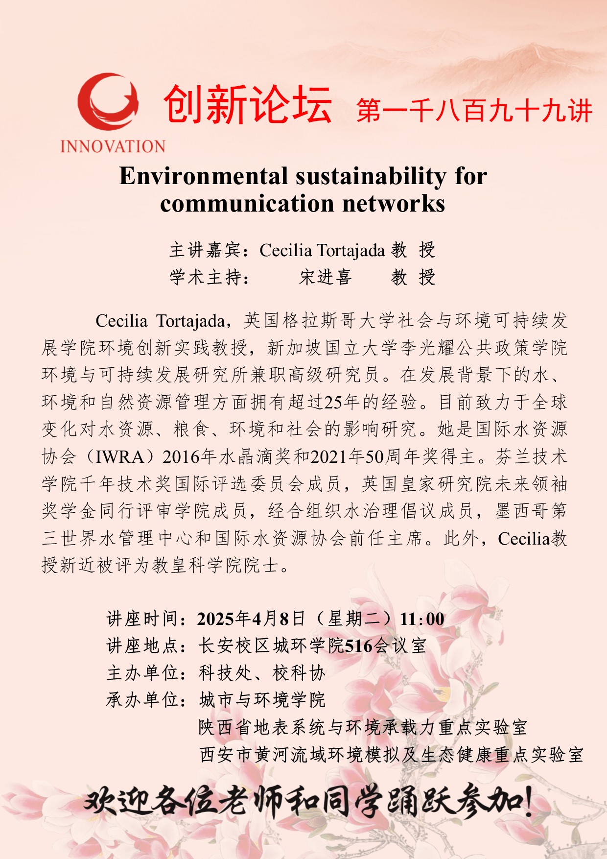 Cecilia Tortajada 教授 星空app官网创新论坛第一千八百九十九讲:Environmental sustainability for communication networks 讲座时间 2025年4月8日(星期二)11:00 讲座地点 长安校区城环学院516会议室 讲座人介绍 Cecilia Tortajada 教授 讲座内容