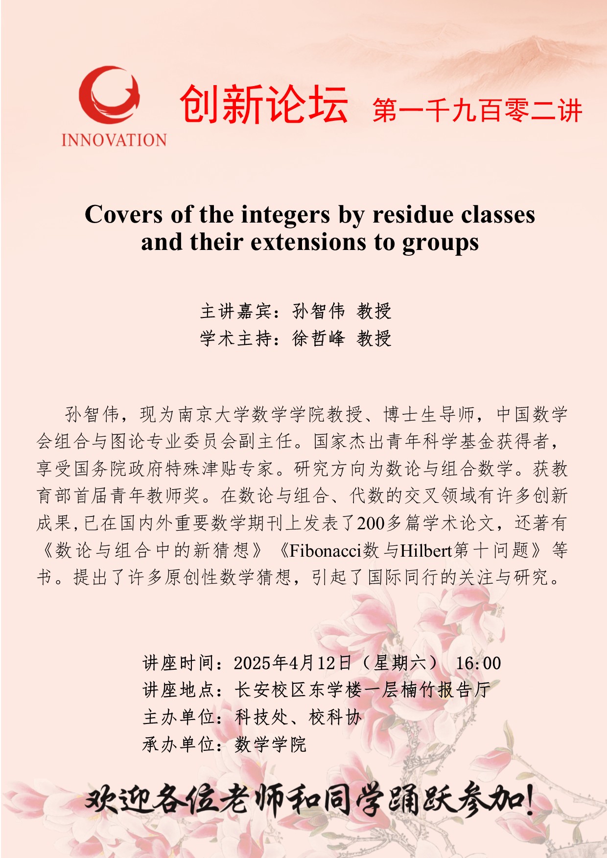 孙智伟 教授 星空app官网创新论坛第一千九百零二讲:Covers of the integers by residue classes and their extensions to groups 讲座时间 2025年4月12日(星期六) 16:00 讲座地点 长安校区东学楼一层楠竹报告厅 讲座人介绍 孙智伟 教授 讲座内容