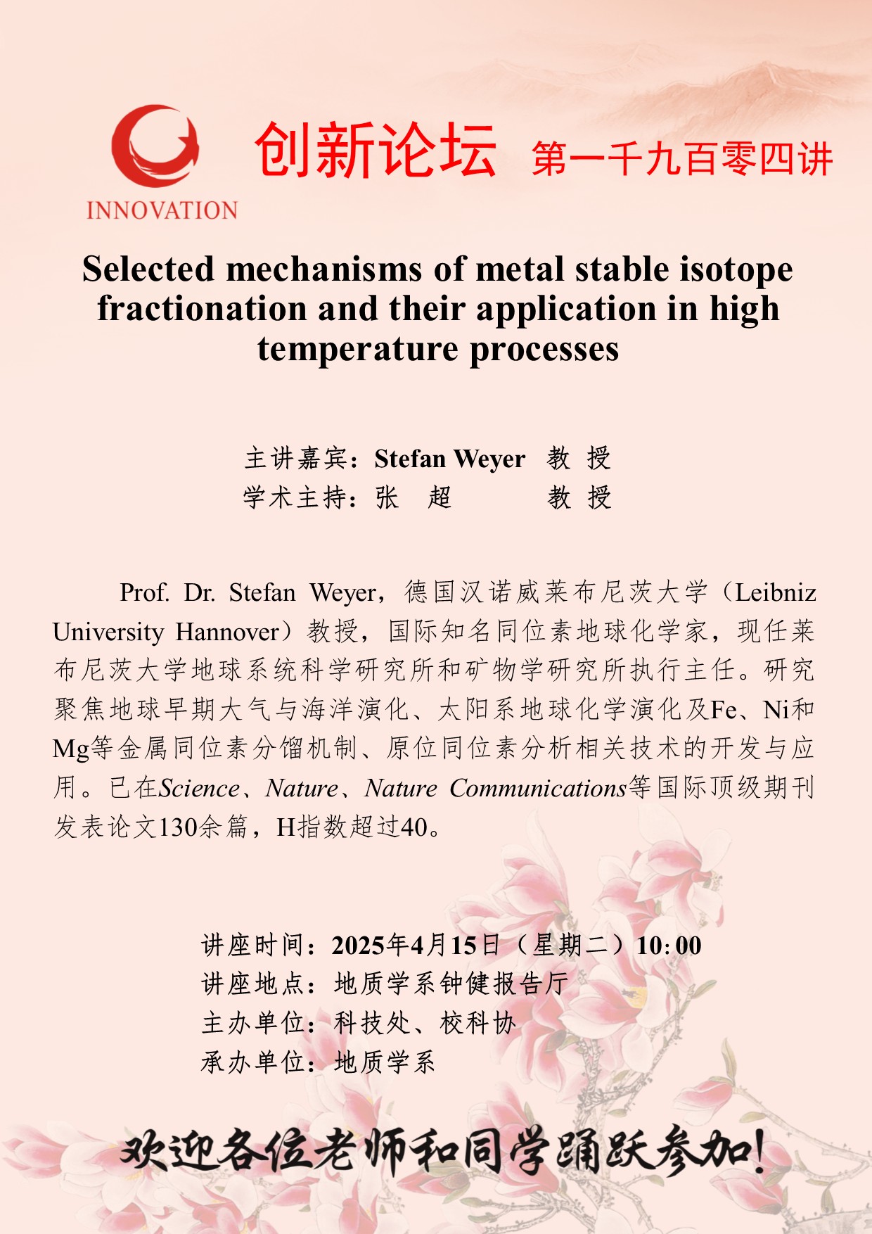 Stefan Weyer 教授 星空app官网创新论坛第一千九百零四讲:Selected mechanisms of metal stable isotope fractionation and their application in high temperature processes 讲座时间 2025年4月15日(星期二)10:00 讲座地点 地质学系钟健报告厅 讲座人介绍 Stefan Weyer 教授 讲座内容