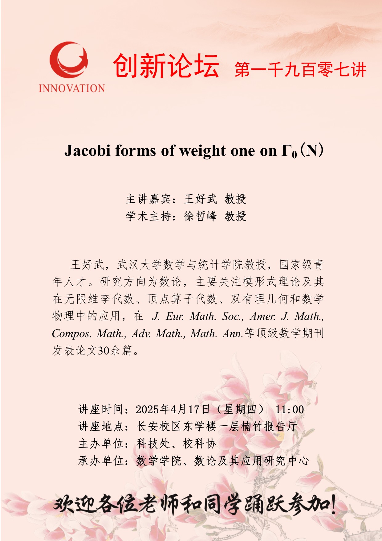 王好武 教授 星空app官网创新论坛第一千九百零七讲:Jacobi forms of weight one on Γ0(N) 讲座时间 2025年4月17日(星期四) 11:00 讲座地点 长安校区东学楼一层楠竹报告厅 讲座人介绍 王好武 教授 讲座内容