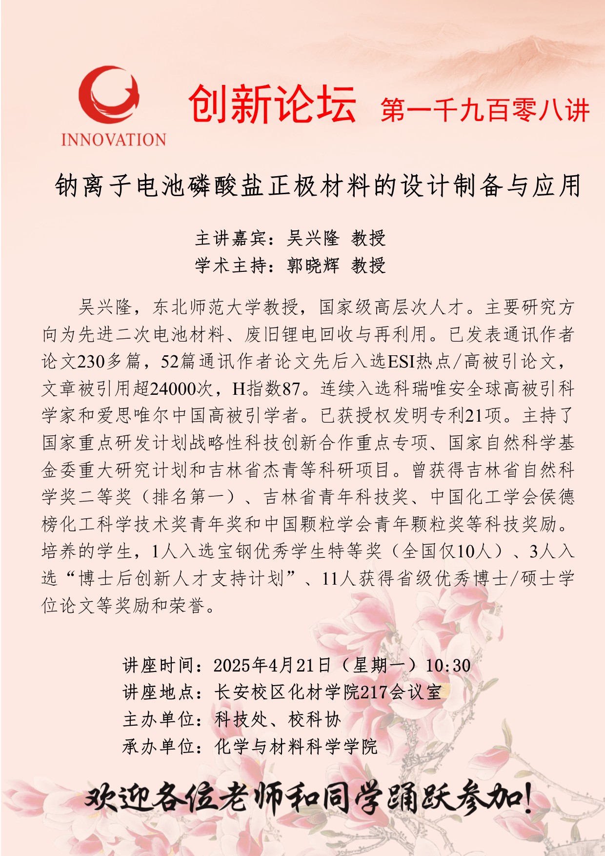 吴兴隆 教授 星空app官网创新论坛第一千九百零八讲:钠离子电池磷酸盐正极材料的设计制备与应用 讲座时间 2025年4月21日(星期一)10:30 讲座地点 长安校区化材学院217会议室 讲座人介绍 吴兴隆 教授 讲座内容