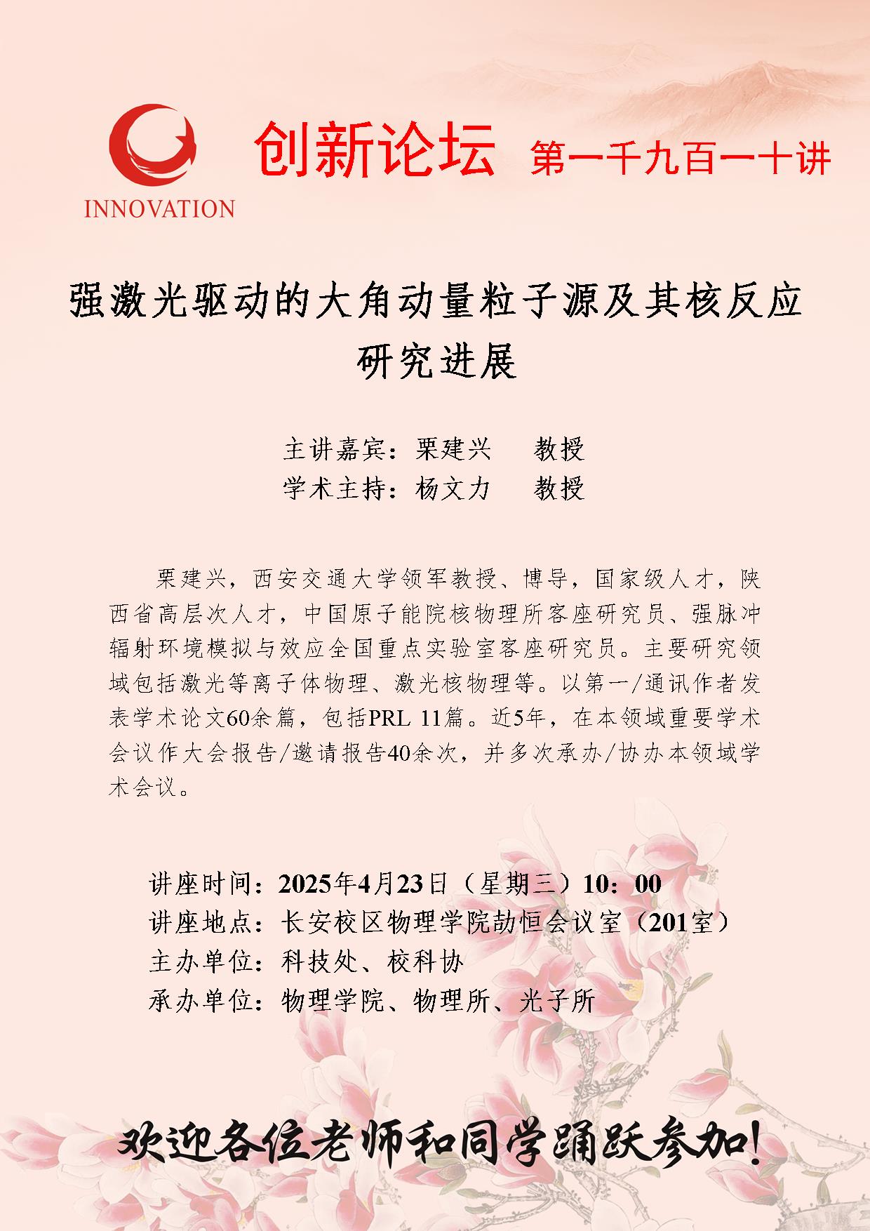 栗建兴 教授 星空app官网创新论坛第一千九百一十讲:强激光驱动的大角动量粒子源及其核反应研究进展 讲座时间 2025年4月23日(星期三)10:00 讲座地点 长安校区物理学院劼恒会议室(201室) 讲座人介绍 栗建兴 教授 讲座内容