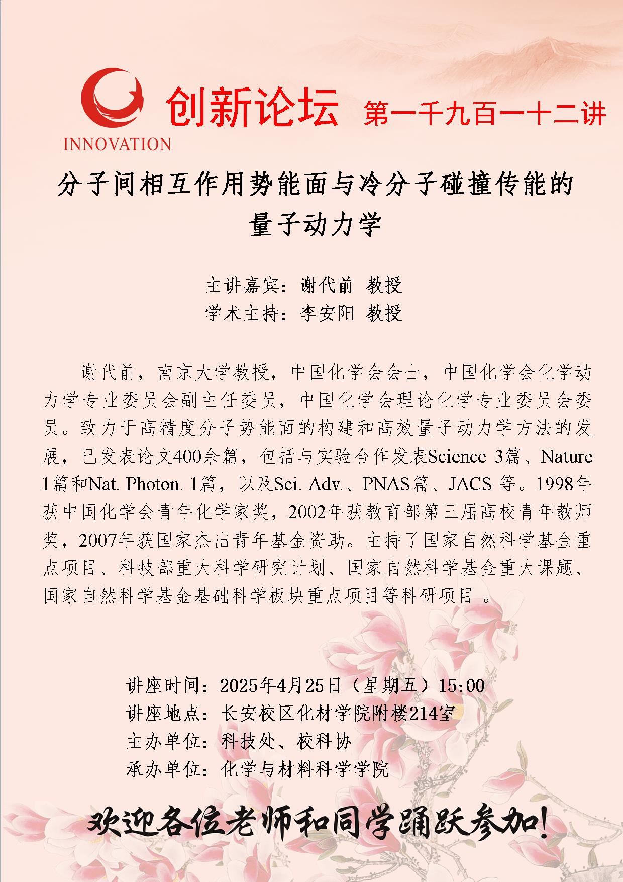 谢代前 教授 星空app官网创新论坛第一千九百一十二讲:分子间相互作用势能面与冷分子碰撞传能的量子动力学 讲座时间 2025年4月25日(星期五)15:00 讲座地点 长安校区化材学院附楼214室 讲座人介绍 谢代前 教授 讲座内容