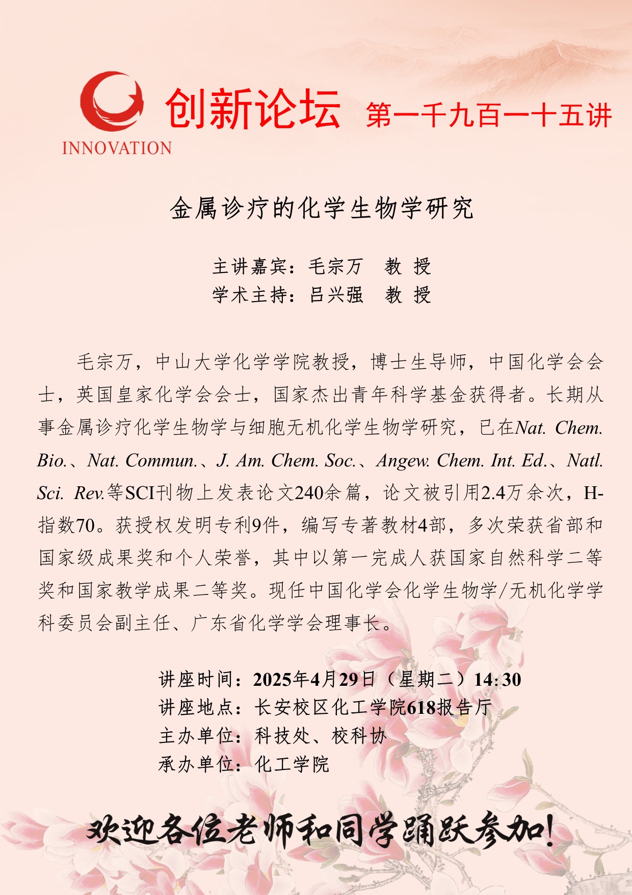 毛宗万 教授 星空app官网创新论坛第一千九百一十五讲:金属诊疗的化学生物学研究 讲座时间 2025年4月29日(星期二)14:30 讲座地点 长安校区化工学院618报告厅 讲座人介绍 毛宗万 教授 讲座内容