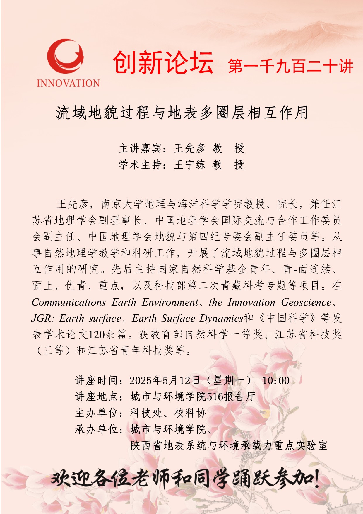 王先彦 教授 星空app官网创新论坛第一千九百二十讲:流域地貌过程与地表多圈层相互作用 讲座时间 2025年5月12日(星期一) 10:00 讲座地点 城市与环境学院516报告厅 讲座人介绍 王先彦 教授 讲座内容