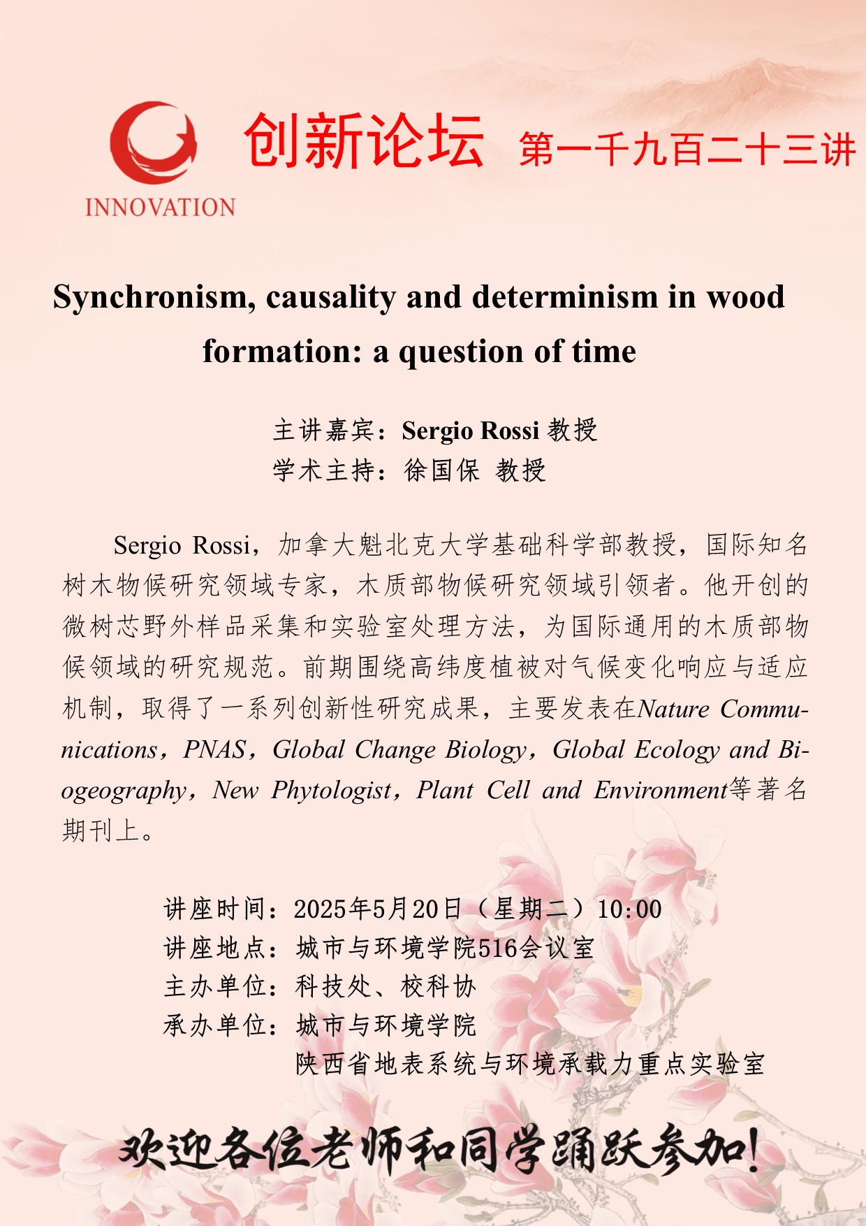 Sergio Rossi 教授 星空app官网创新论坛第一千九百二十三讲:Synchronism, causality and determinism in wood formation: a question of time 讲座时间 2025年5月20日(星期二)10:00 讲座地点 城市与环境学院516会议室 讲座人介绍 Sergio Rossi 教授 讲座内容