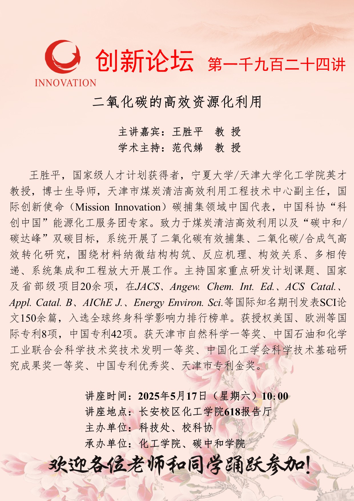 王胜平 教授 星空app官网创新论坛第一千九百二十四讲:二氧化碳的高效资源化利用 讲座时间 2025年5月17日(星期六)10:00 讲座地点 长安校区化工学院618报告厅 讲座人介绍 王胜平 教授 讲座内容