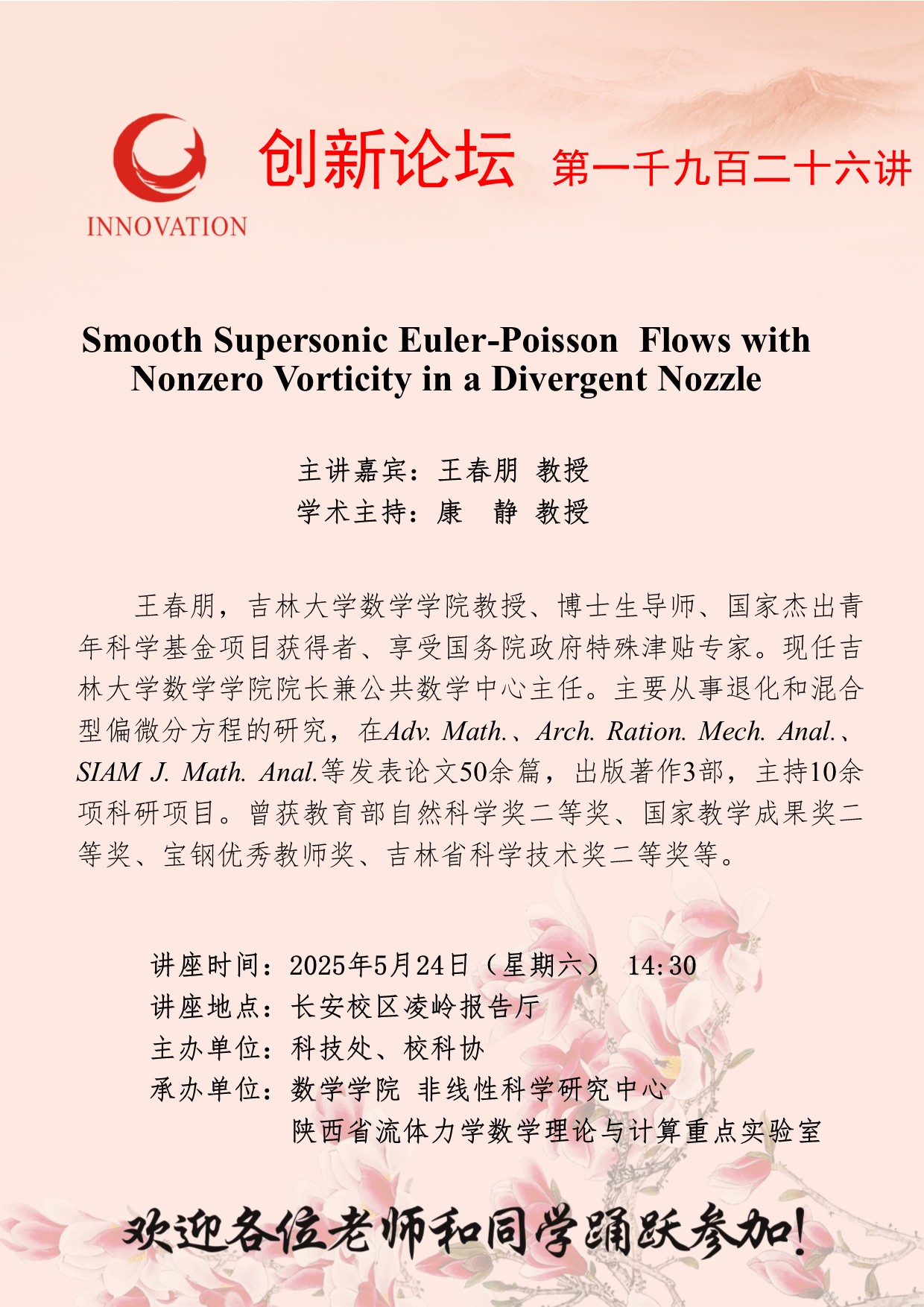 王春朋 教授 星空app官网创新论坛第一千九百二十六讲:Smooth Supersonic Euler-Poisson Flows with Nonzero Vorticity in a Divergent Nozzle 讲座时间 2025年5月24日(星期六) 14:30 讲座地点 长安校区凌岭报告厅 讲座人介绍 王春朋 教授 讲座内容