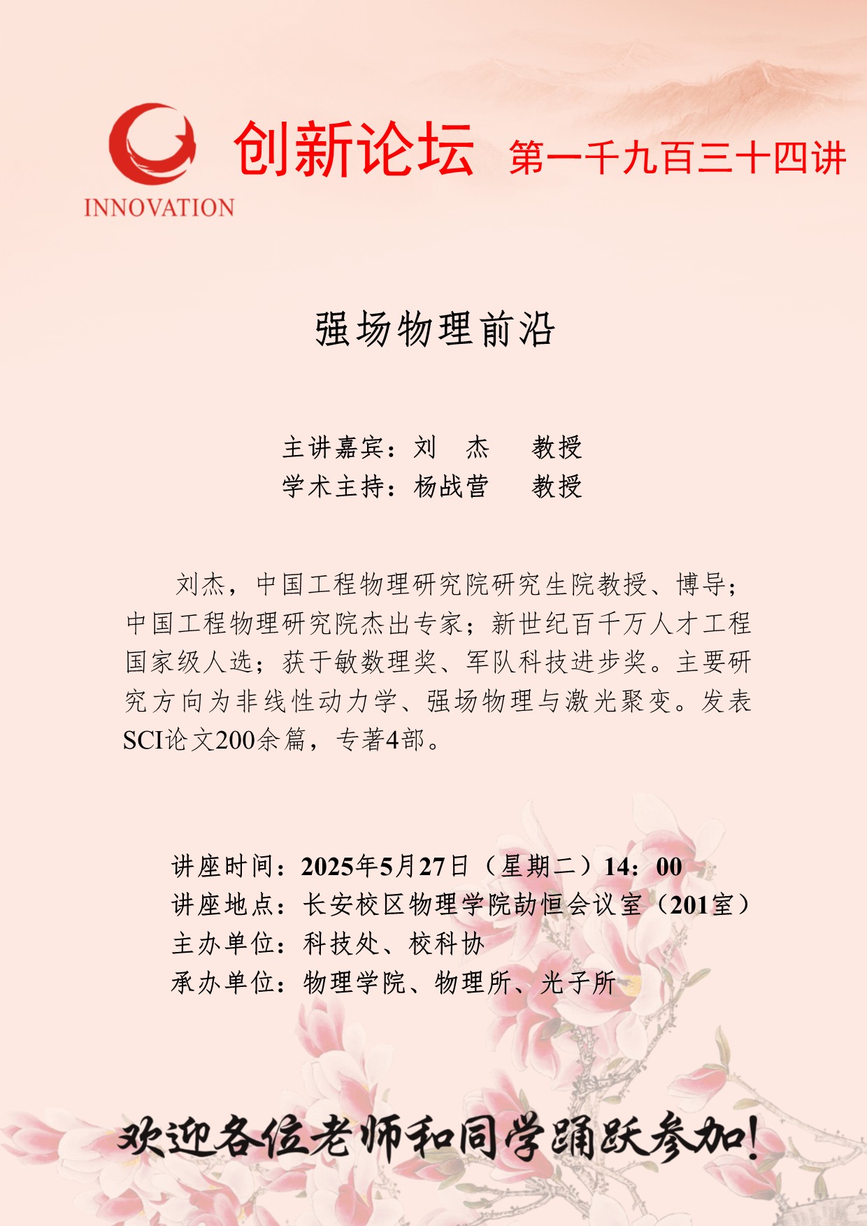 刘杰 教授 星空app官网创新论坛第一千九百三十四讲:强场物理前沿 讲座时间 2025年5月27日(星期二)14:00 讲座地点 长安校区物理学院劼恒会议室(201室) 讲座人介绍 刘杰 教授 讲座内容