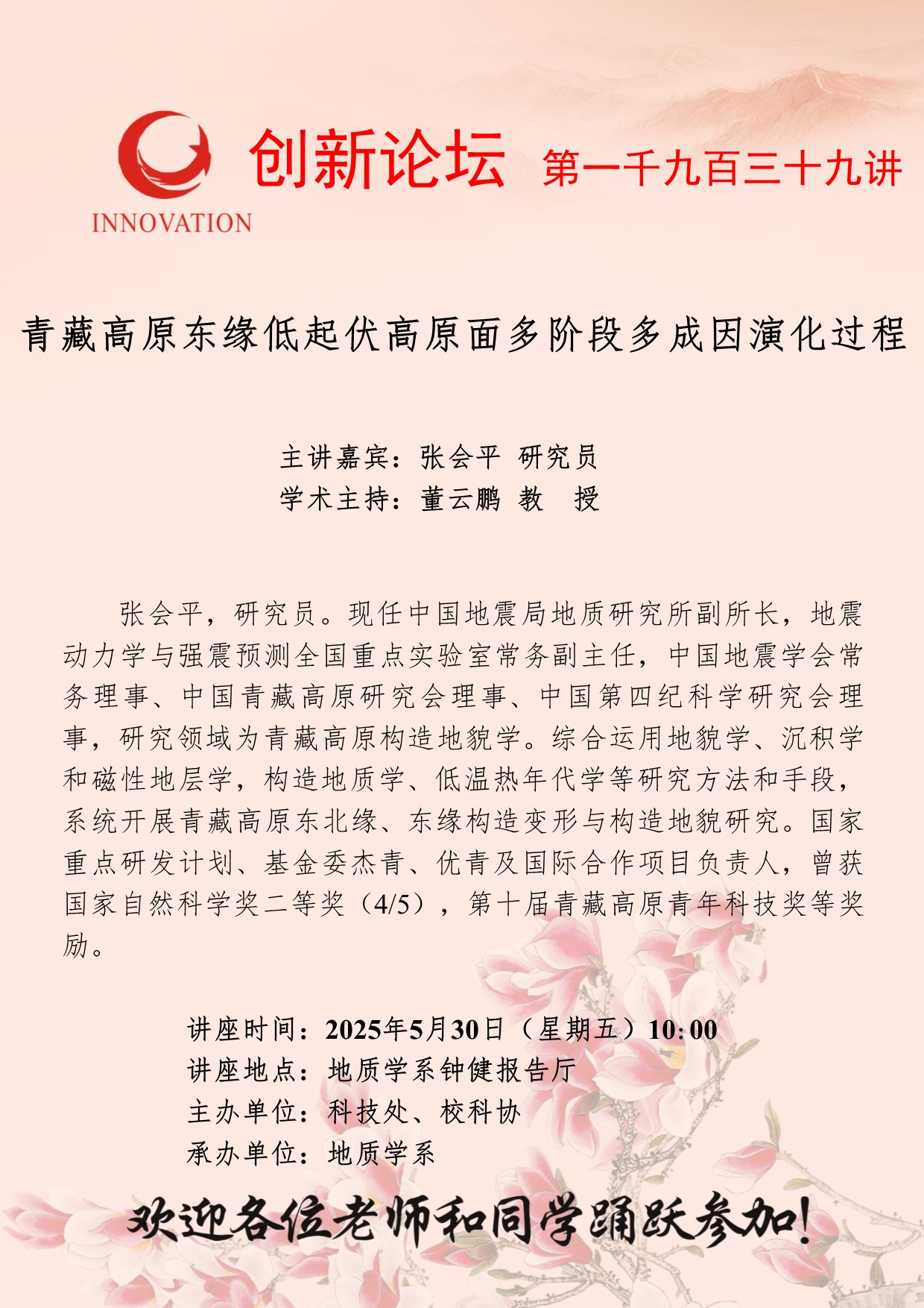 张会平 研究员 星空app官网创新论坛第一千九百三十九讲:青藏高原东缘低起伏高原面多阶段多成因演化过程 讲座时间 2025年5月30日(星期五)10:00 讲座地点 地质学系钟健报告厅 讲座人介绍 张会平 研究员 讲座内容