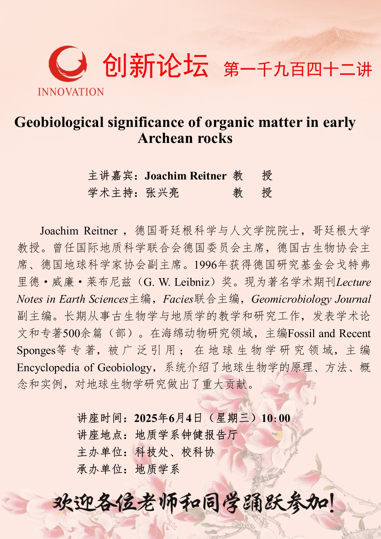 Joachim Reitner 教授 星空app官网创新论坛第一千九百四十二讲:Geobiological significance of organic matter in early Archean rocks 讲座时间 2025年6月4日(星期三)10:00 讲座地点 地质学系钟健报告厅 讲座人介绍 Joachim Reitner 教授 讲座内容