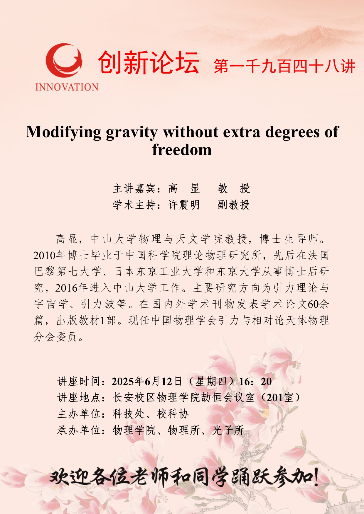 高显 教授 星空app官网创新论坛第一千九百四十八讲:Modifying gravity without extra degrees of freedom 讲座时间 2025年6月12日(星期四)16:20 讲座地点 长安校区物理学院劼恒会议室(201室) 讲座人介绍 高显 教授 讲座内容
