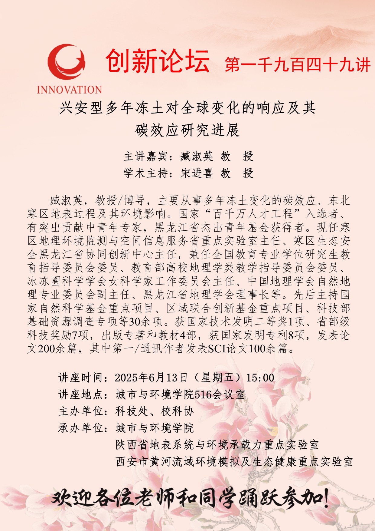 臧淑英 教授 星空app官网创新论坛第一千九百四十九讲:兴安型多年冻土对全球变化的响应及其碳效应研究进展 讲座时间 2025年6月13日(星期五)15:00 讲座地点 城市与环境学院516会议室 讲座人介绍 臧淑英 教授 讲座内容