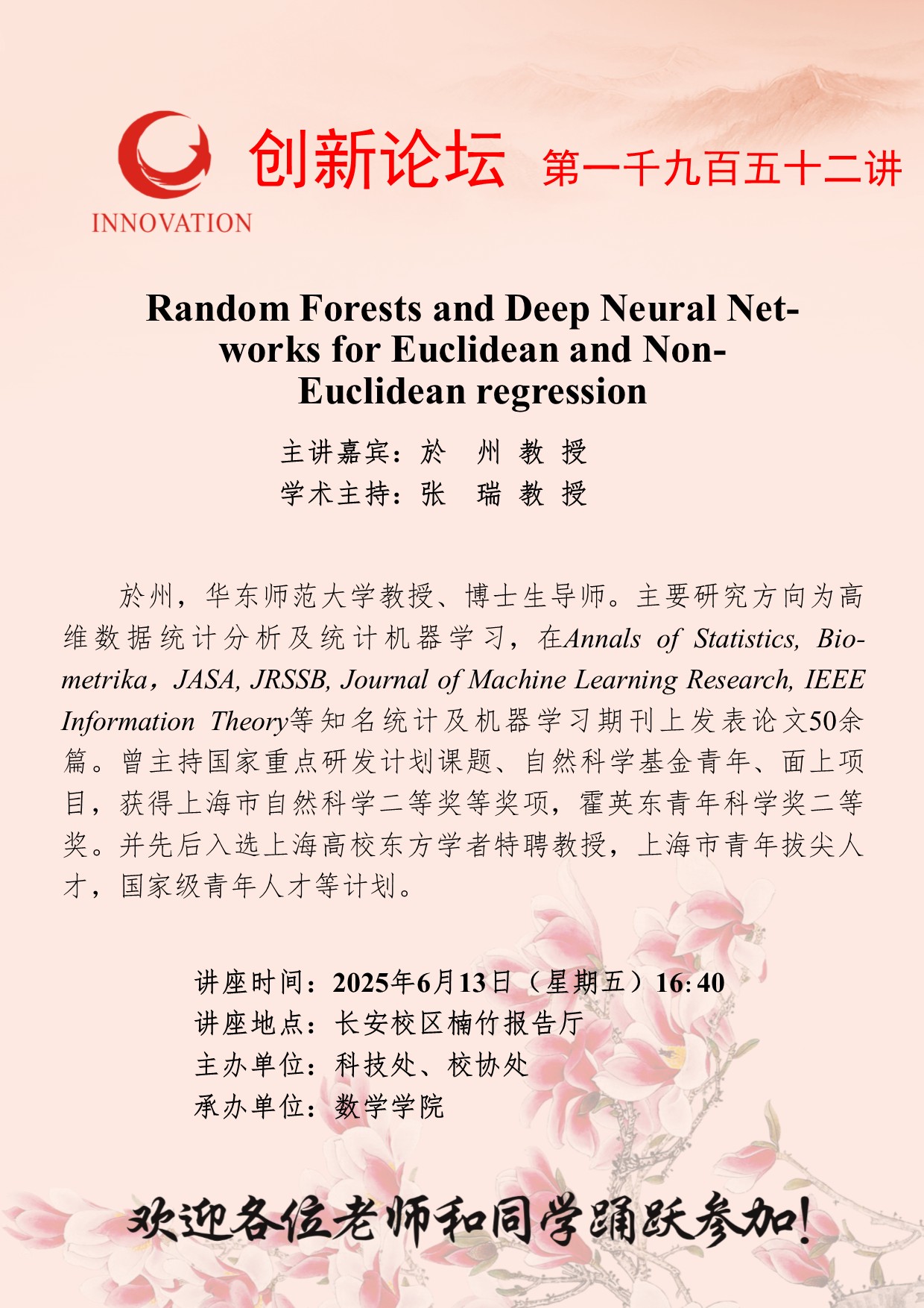 於州 教授 星空app官网创新论坛第一千九百五十二讲:Random Forests and Deep Neural Networks for Euclidean and Non-Euclidean regression 讲座时间 2025年6月13日(星期五)16:40 讲座地点 长安校区楠竹报告厅 讲座人介绍 於州 教授 讲座内容