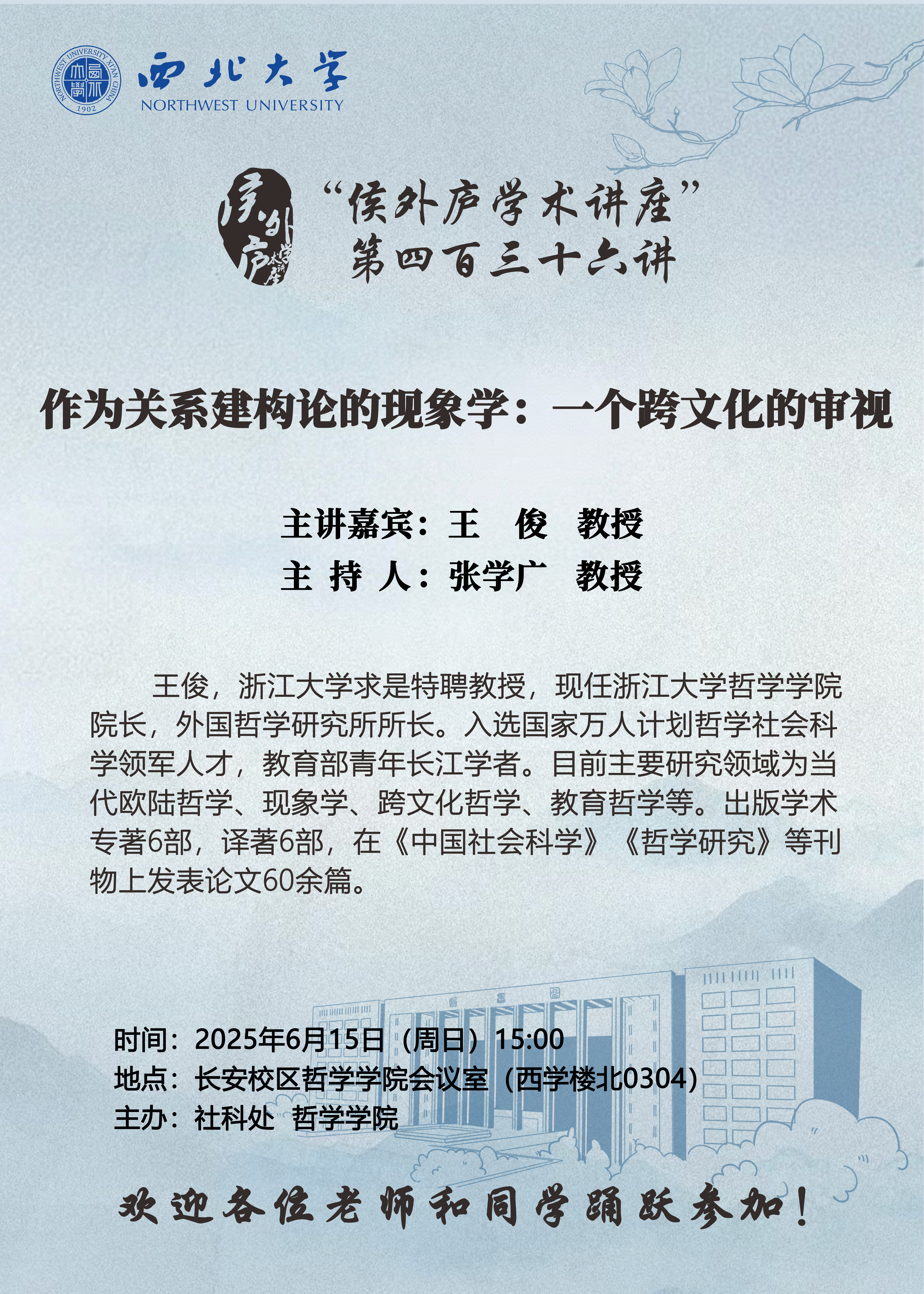 王俊 教授 “侯外庐学术讲座”第四百三十六讲:作为关系建构论的现象学:一个跨文化的审视 讲座时间 2025年6月15日(周日)15:00 讲座地点 长安校区哲学学院会议室(西学楼北0304) 讲座人介绍 王俊 教授 讲座内容