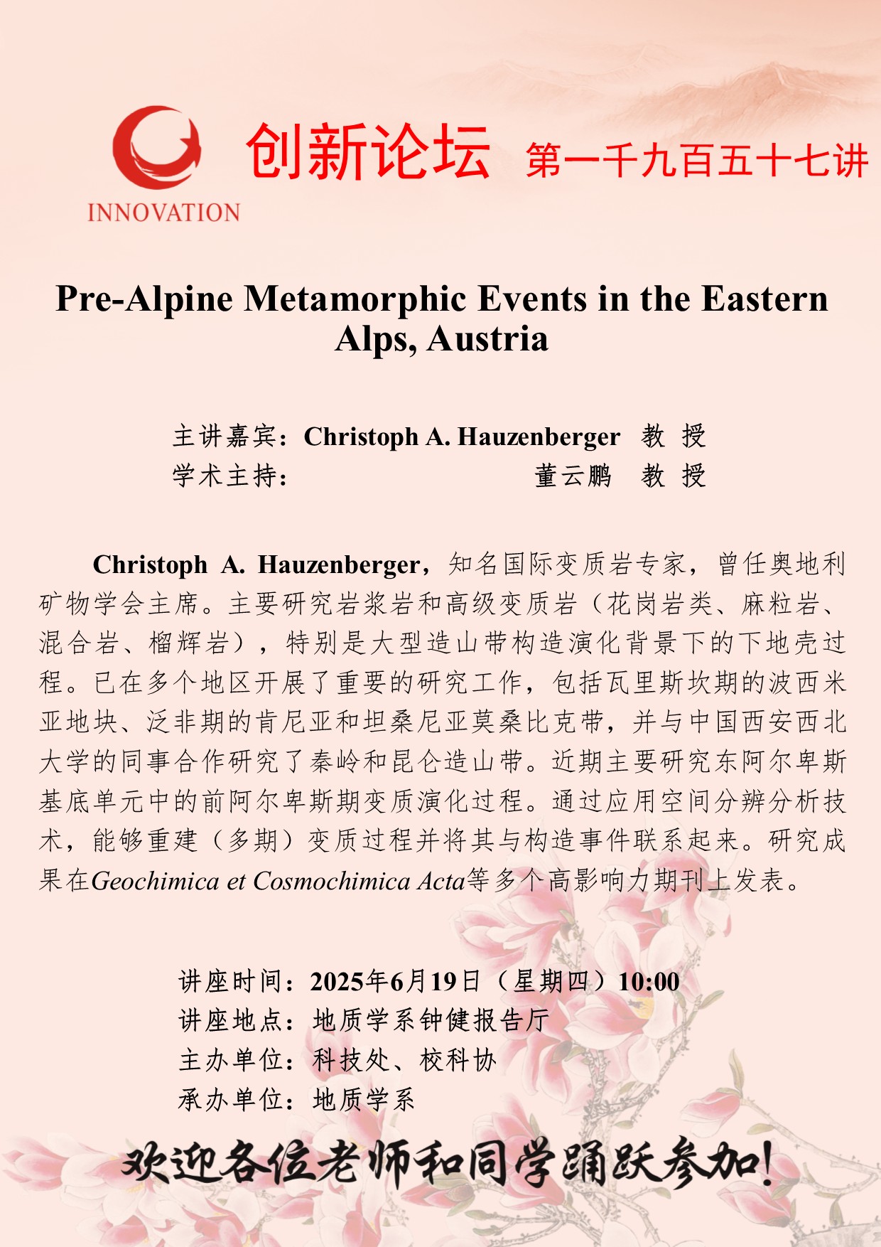 Christoph A. Hauzenberger 教授 星空app官网创新论坛第一千九百五十七讲:Pre-Alpine Metamorphic Events in the Eastern Alps, Austria 讲座时间 2025年6月19日(星期四)10:00 讲座地点 地质学系钟健报告厅 讲座人介绍 Christoph A. Hauzenberger 教授 讲座内容