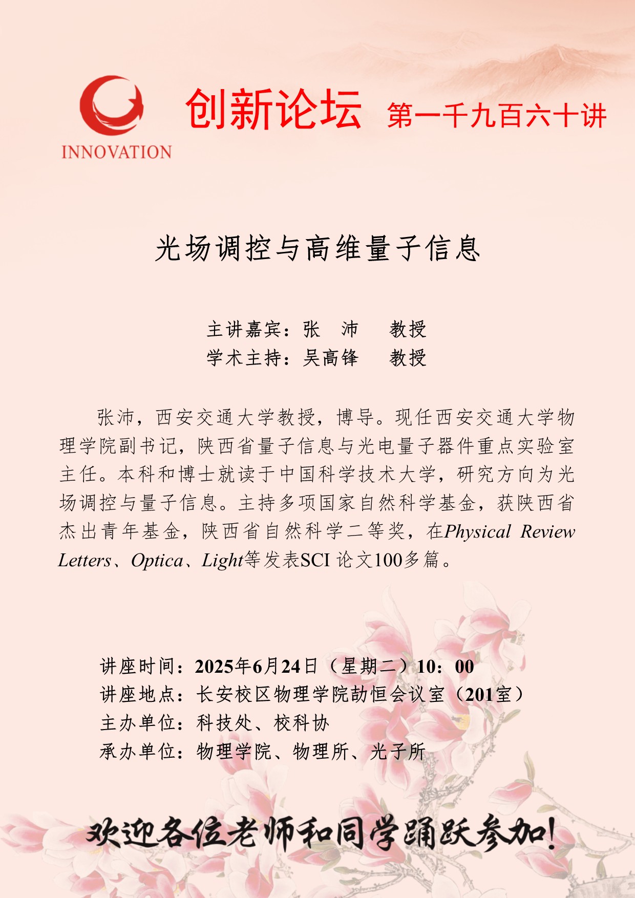 张沛 教授 星空app官网创新论坛第一千九百六十讲:光场调控与高维量子信息 讲座时间 2025年6月24日(星期二)10:00 讲座地点 长安校区物理学院劼恒会议室(201室) 讲座人介绍 张沛 教授 讲座内容