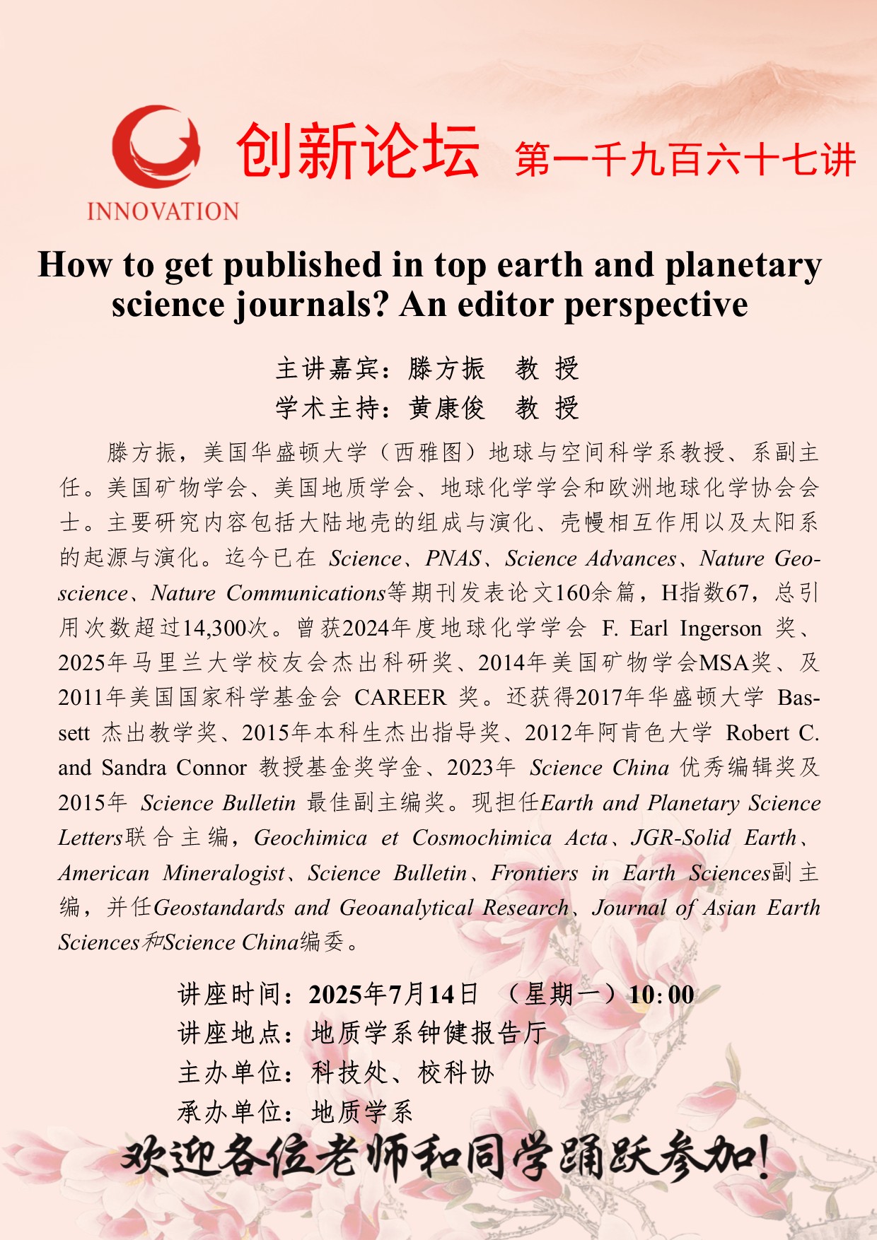 滕方振 教授 星空app官网创新论坛第一千九百六十七讲:How to get published in top earth and planetary science journals? An editor perspective 讲座时间 2025年7月14日 (星期一)10:00 讲座地点 地质学系钟健报告厅 讲座人介绍 滕方振 教授 讲座内容