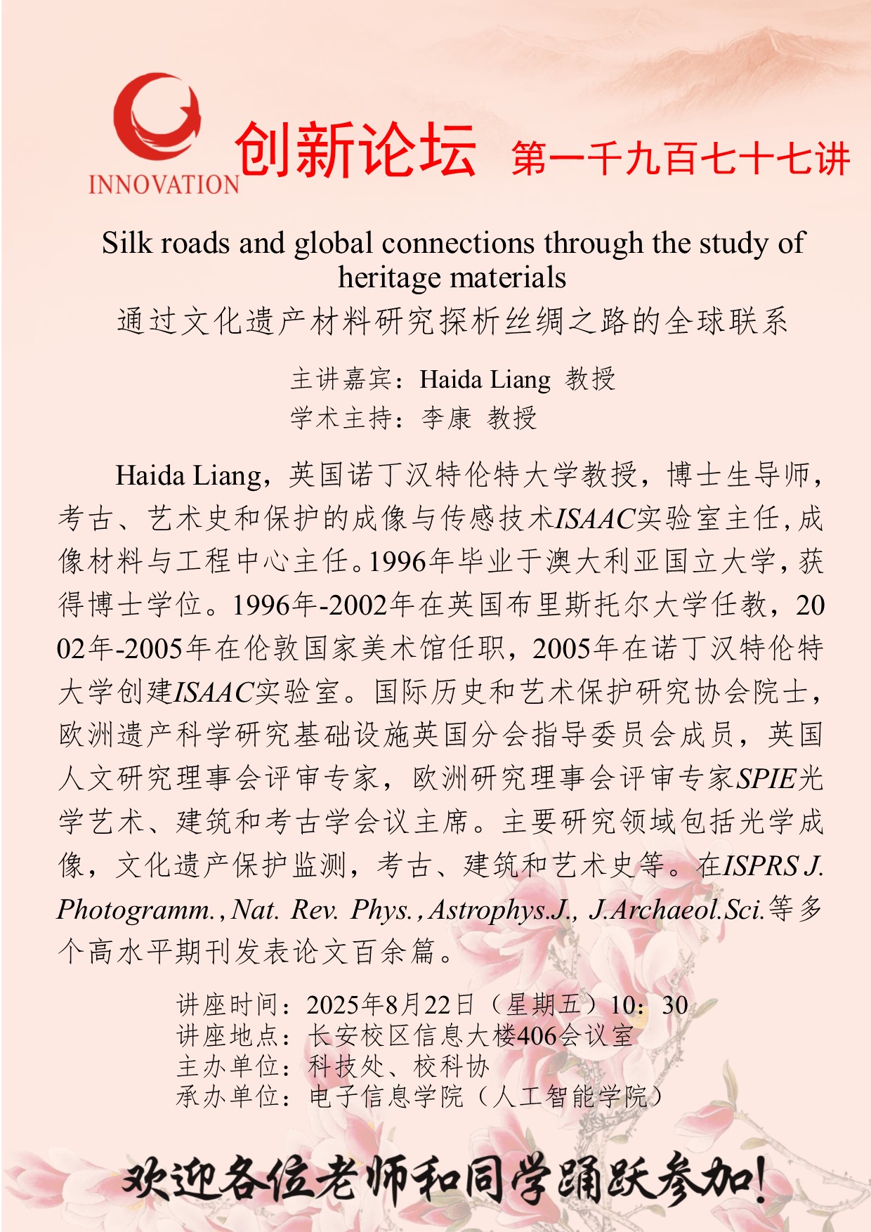 梁海达 教授 星空app官网创新论坛第一千九百七十七讲:Silk roads and global connections through the study of heritage materials 讲座时间 2025年8月22日(星期五)10:30 讲座地点 长安校区信息大楼406会议室 讲座人介绍 梁海达 教授 讲座内容