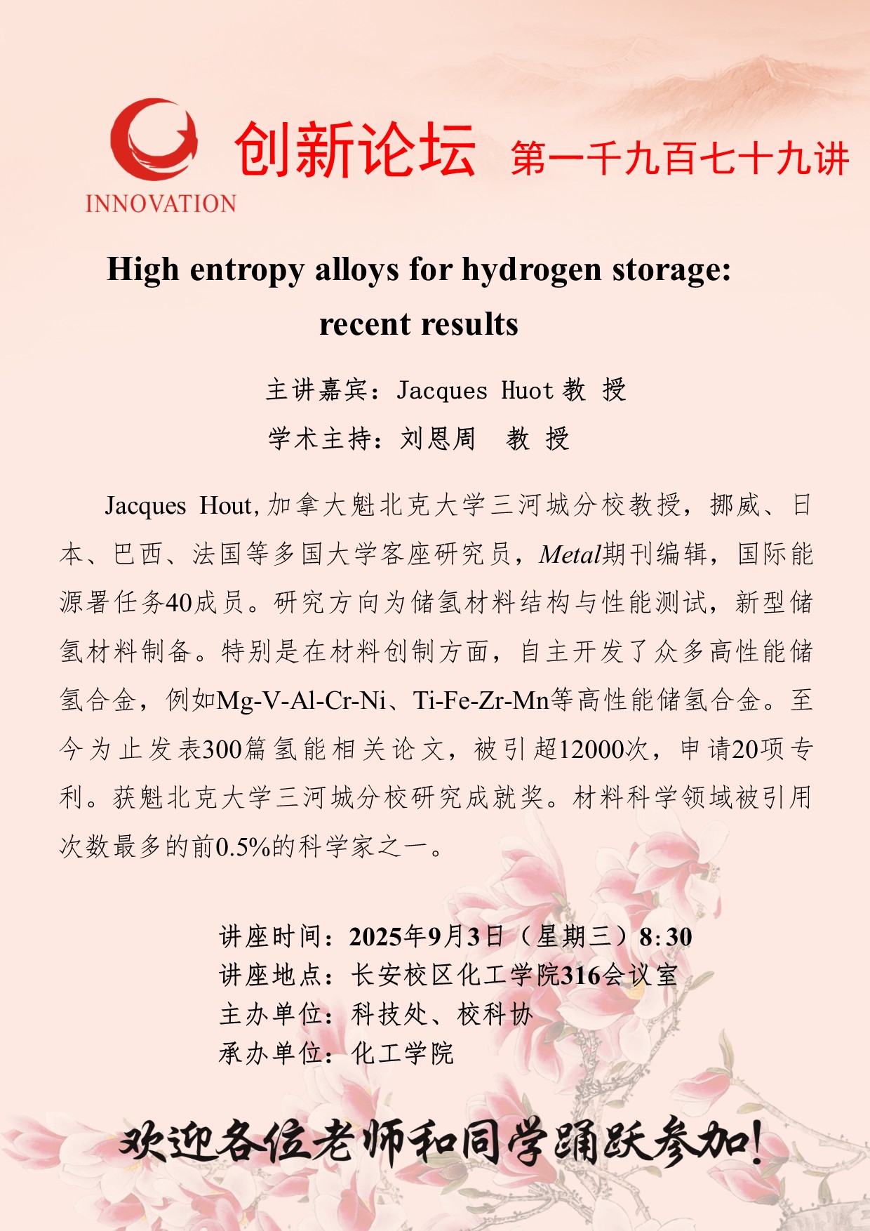 Jacques Huot 教授 星空app官网创新论坛第一千九百七十九讲:High entropy alloys for hydrogen storage: recent results 讲座时间 2025年9月3日(星期三)8:30 讲座地点 长安校区化工学院316会议室 讲座人介绍 Jacques Huot 教授 讲座内容