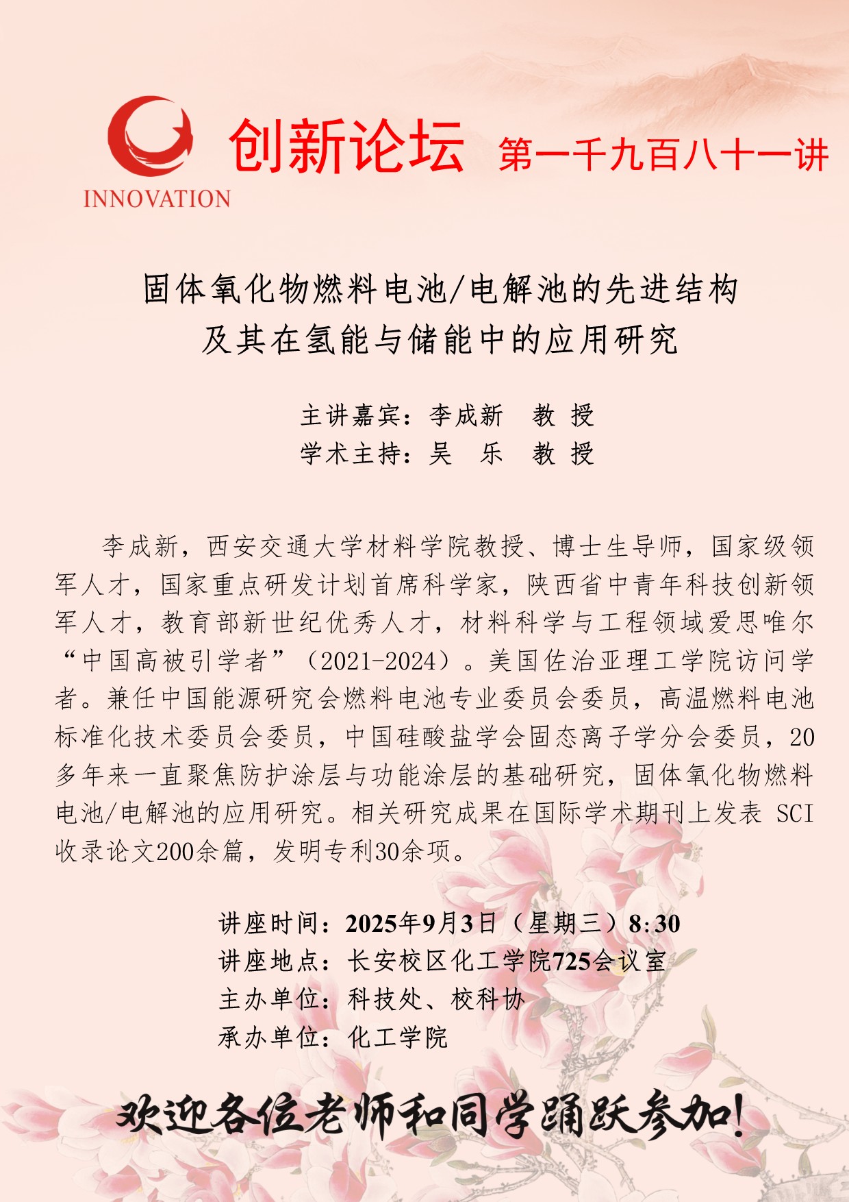 李成新 教授 星空app官网创新论坛第一千九百八十一讲:固体氧化物燃料电池/电解池的先进结构及其在氢能与储能中的应用研究 讲座时间 2025年9月3日(星期三)8:30 讲座地点 长安校区化工学院725会议室 讲座人介绍 李成新 教授 讲座内容