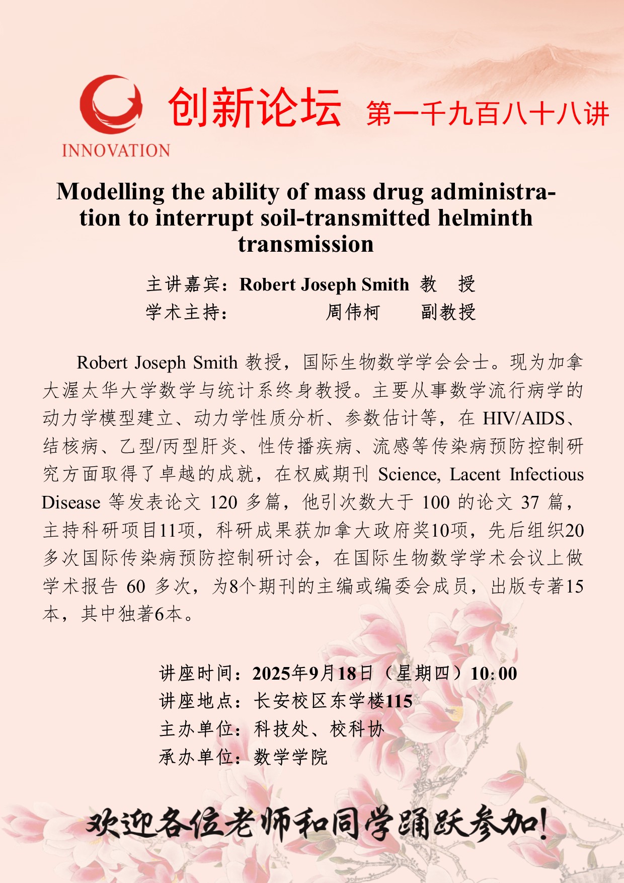 Robert Joseph Smith 教授 星空app官网创新论坛第一千九百八十八讲:Modelling the ability of mass drug administration to interrupt soil-transmitted helminth transmission 讲座时间 2025年9月18日(星期四)10:00 讲座地点 长安校区东学楼115 讲座人介绍 Robert Joseph Smith 教授 讲座内容