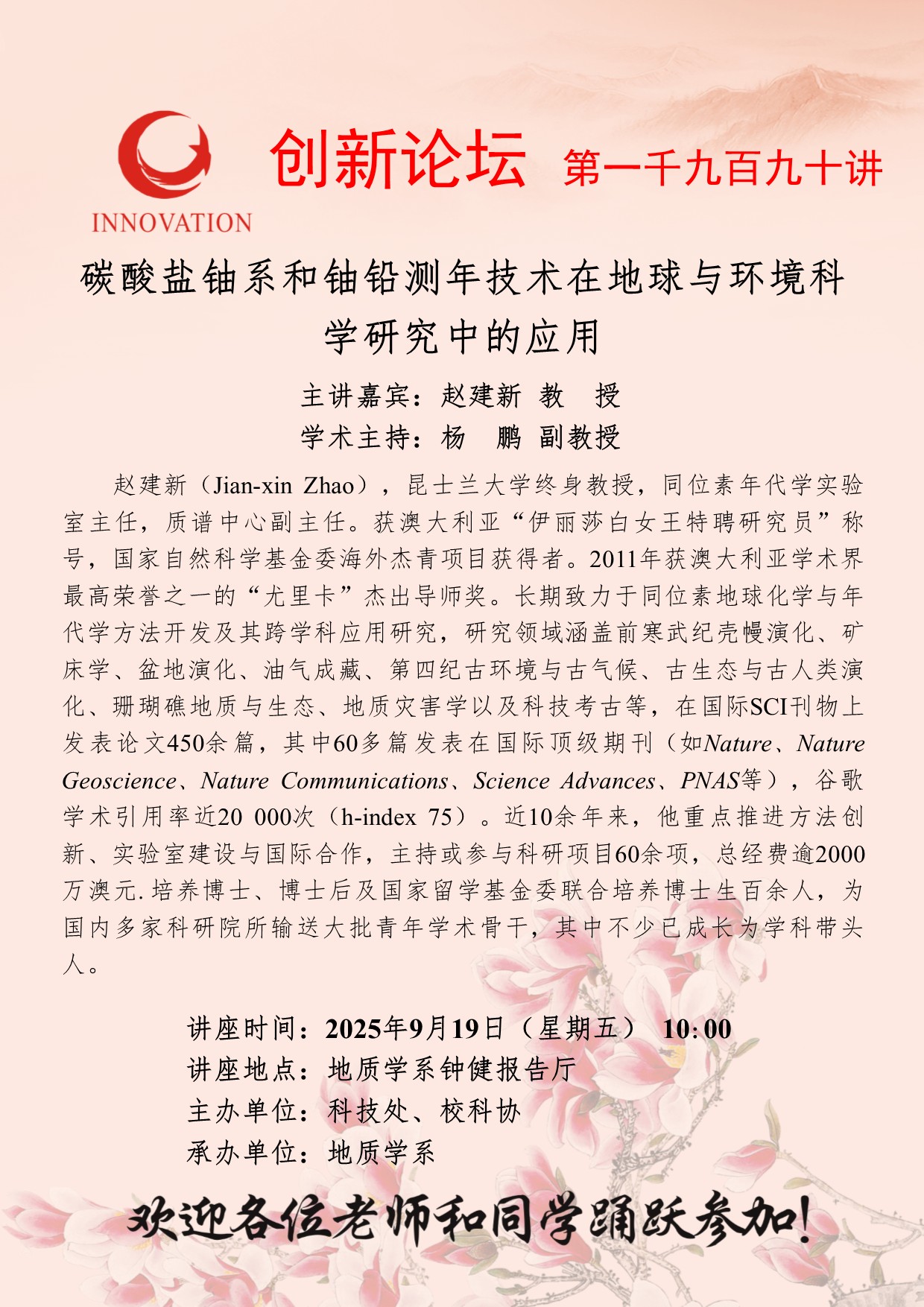 赵建新 教授 星空app官网创新论坛第一千九百九十讲:碳酸盐铀系和铀铅测年技术在地球与环境科学研究中的应用 讲座时间 2025年9月19日(星期五) 10:00 讲座地点 地质学系钟健报告厅 讲座人介绍 赵建新 教授 讲座内容