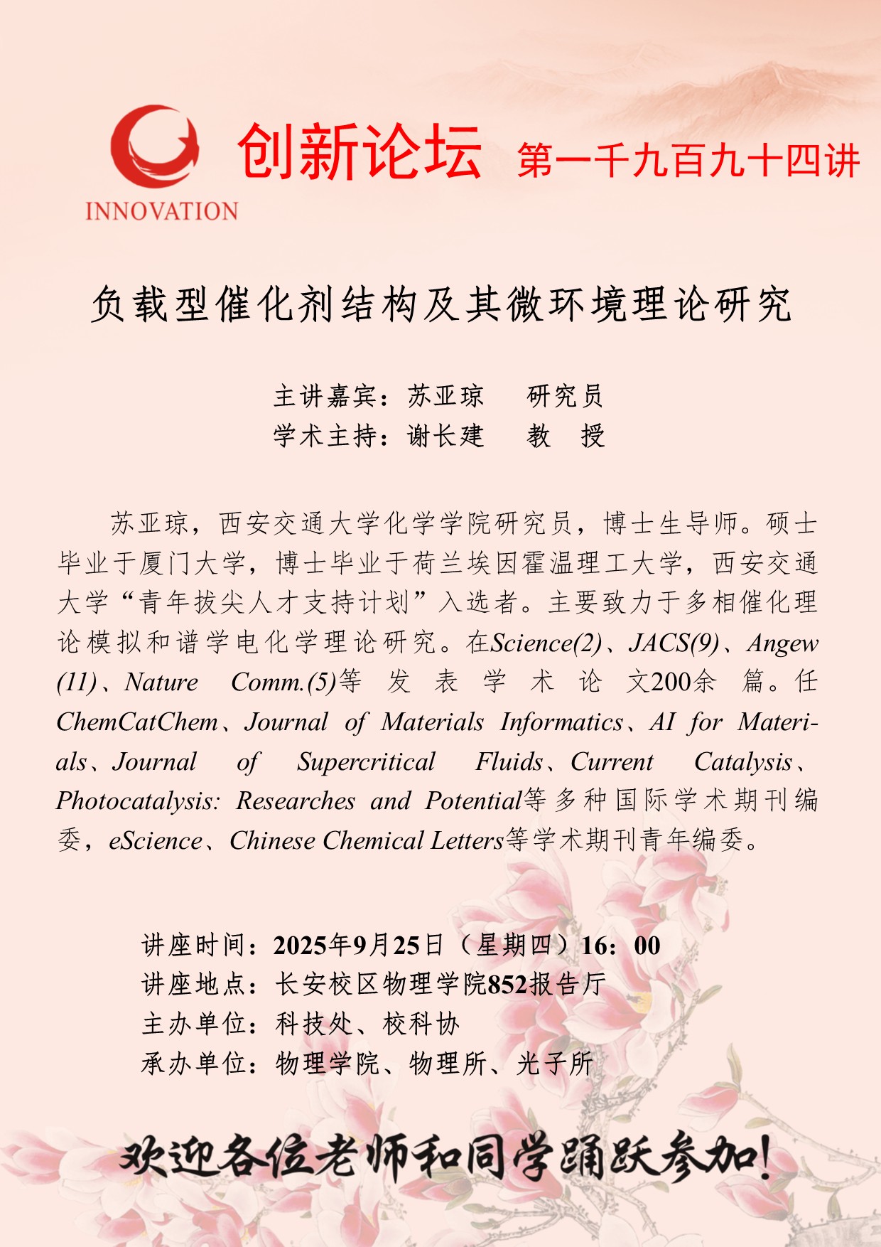 苏亚琼 研究员 星空app官网创新论坛第一千九百九十四讲:负载型催化剂结构及其微环境理论研究 讲座时间 2025年9月25日(星期四)16:00 讲座地点 长安校区物理学院852报告厅 讲座人介绍 苏亚琼 研究员 讲座内容