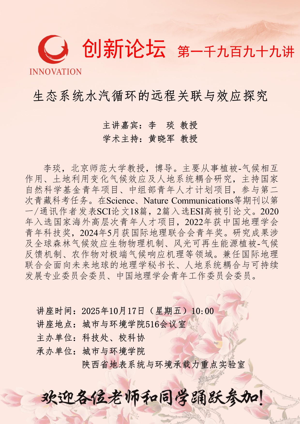 李 琰 教授 星空app官网创新论坛第一千九百九十九讲:生态系统水汽循环的远程关联与效应探究 讲座时间 2025年10月17日(星期五)10:00 讲座地点 城市与环境学院516会议室 讲座人介绍 李 琰 教授 讲座内容