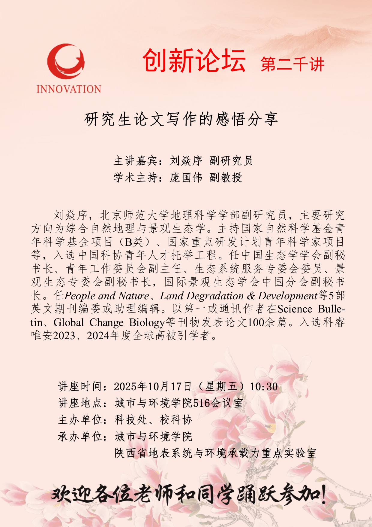 刘焱序 副研究员 星空app官网创新论坛第二千讲:研究生论文写作的感悟分享 讲座时间 2025年10月17日(星期五)10:30 讲座地点 城市与环境学院516会议室 讲座人介绍 刘焱序 副研究员 讲座内容