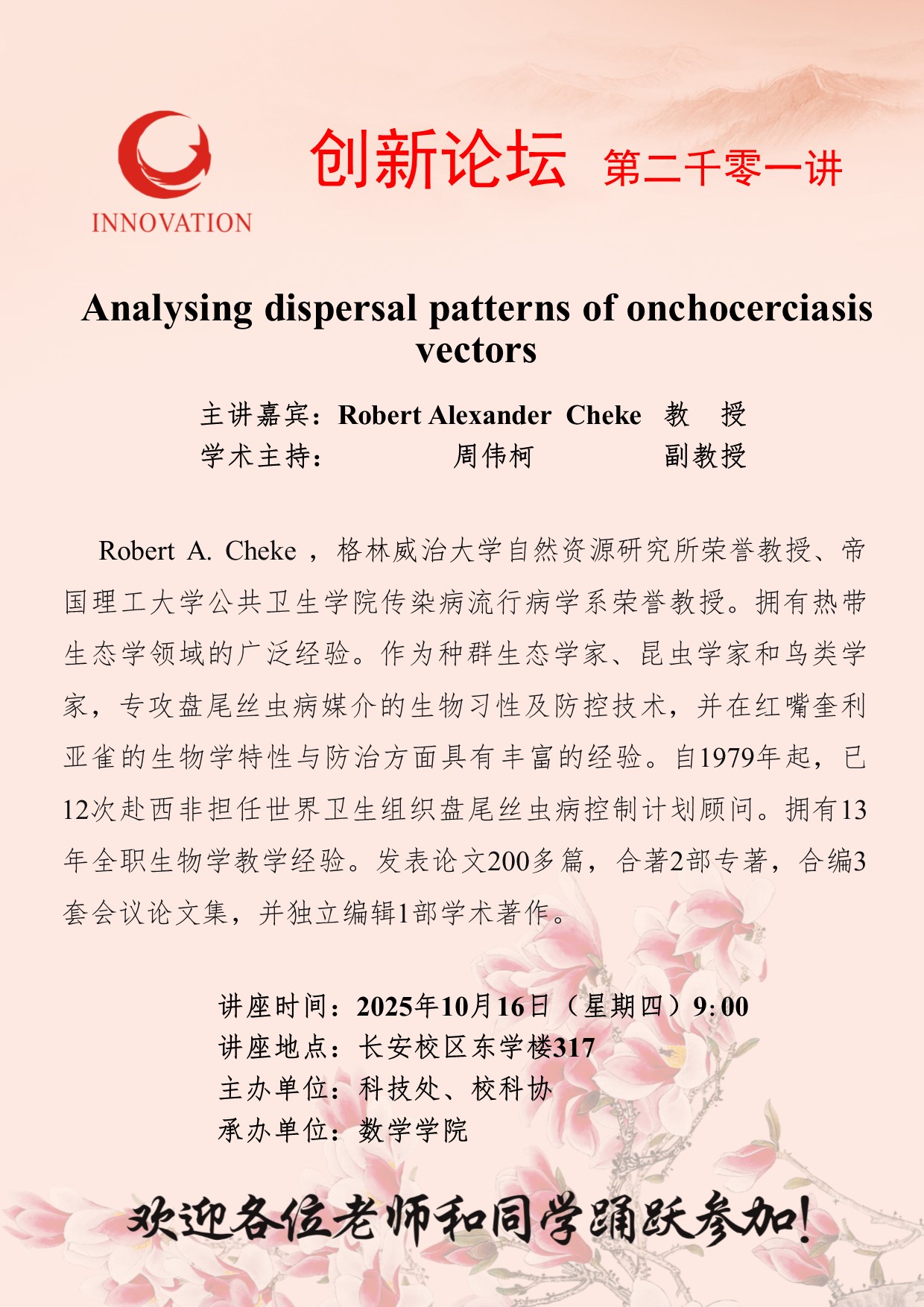 Robert Alexander Cheke 教授 星空app官网创新论坛第二千零一讲:Analysing dispersal patterns of onchocerciasis vectors 讲座时间 2025年10月16日(星期四)9:00 讲座地点 长安校区东学楼317 讲座人介绍 Robert Alexander Cheke 教授 讲座内容