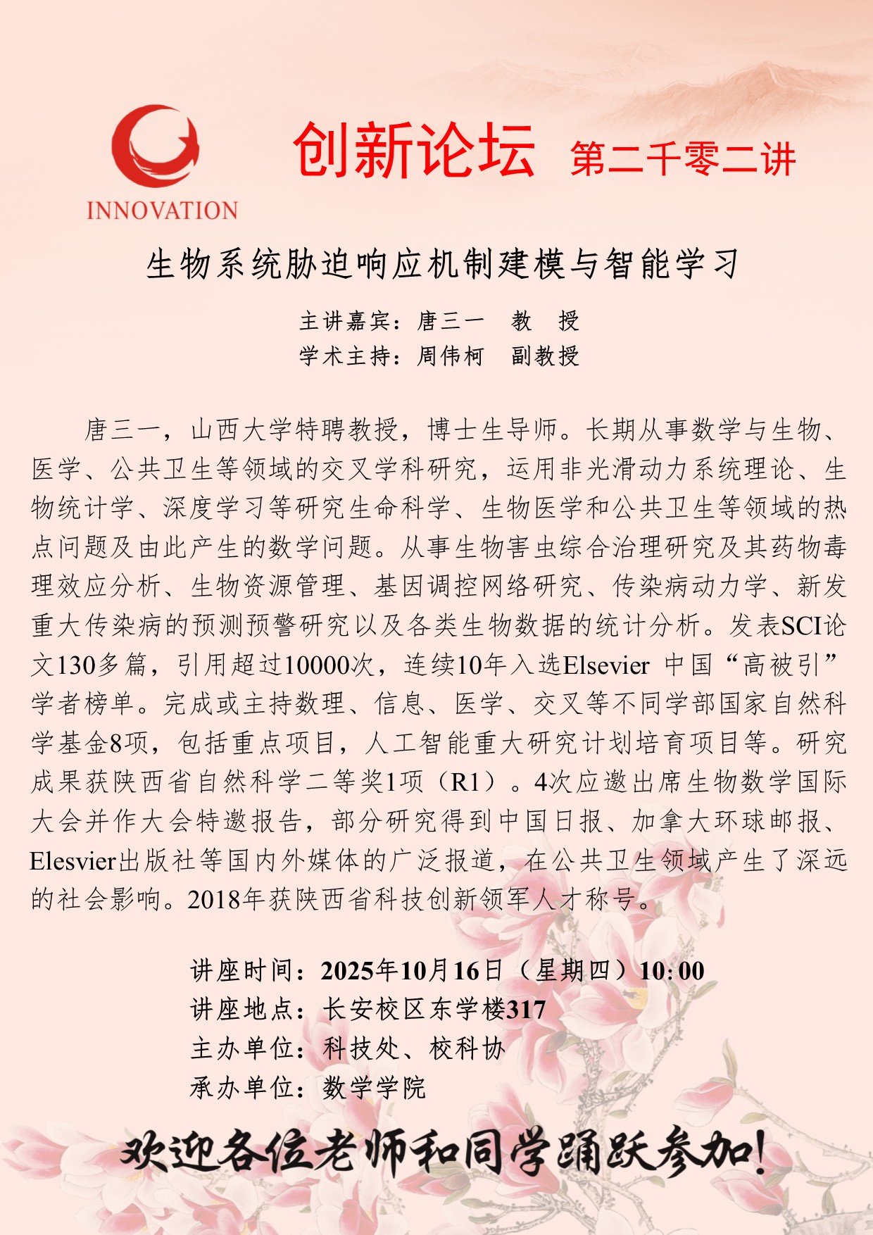 唐三一 教授 星空app官网创新论坛第二千零二讲:生物系统胁迫响应机制建模与智能学习 讲座时间 2025年10月16日(星期四)10:00 讲座地点 长安校区东学楼317 讲座人介绍 唐三一 教授 讲座内容