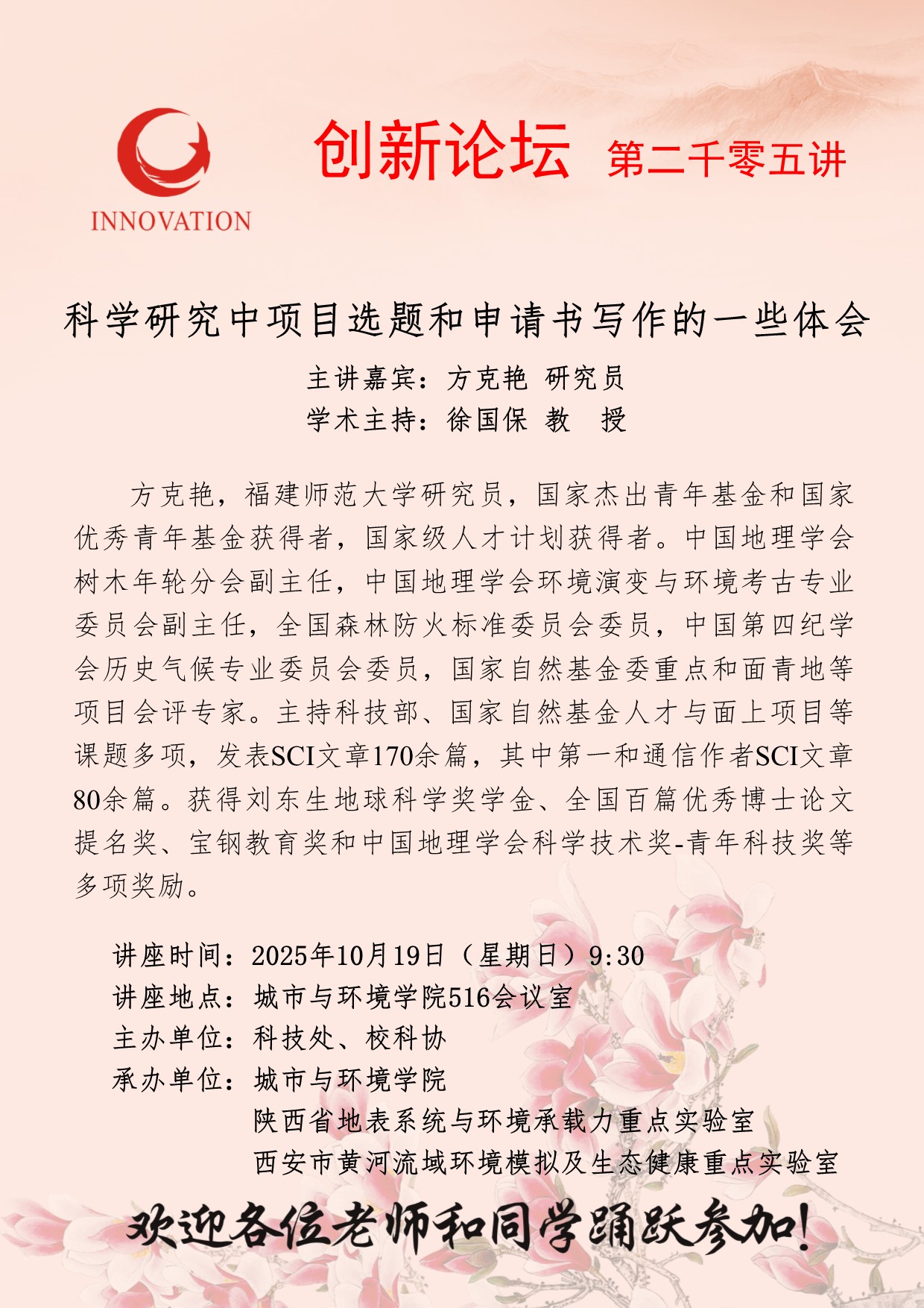 方克艳 研究员 星空app官网创新论坛第二千零五讲:科学研究中项目选题和申请书写作的一些体会 讲座时间 2025年10月19日(星期日)9:30 讲座地点 城市与环境学院516会议室 讲座人介绍 方克艳 研究员 讲座内容