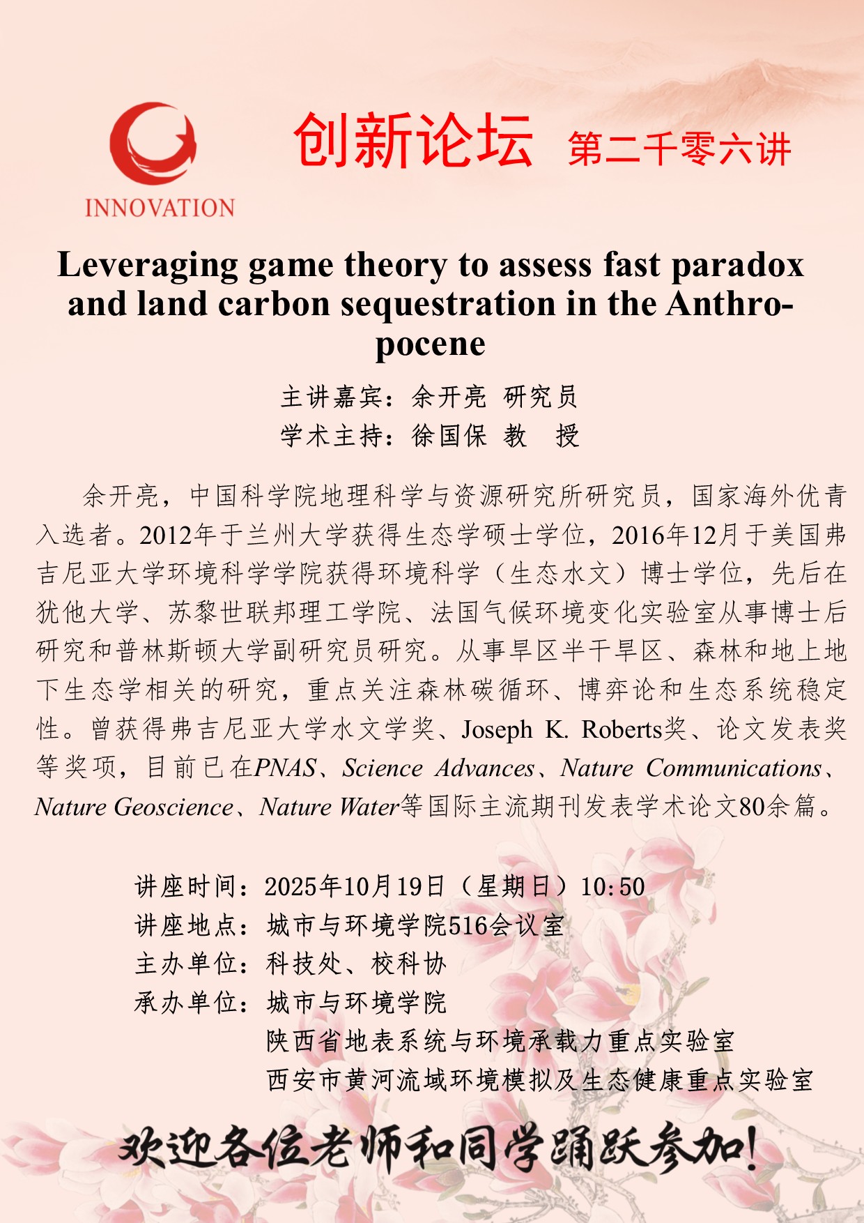 余开亮 研究员 星空app官网创新论坛第二千零六讲:Leveraging game theory to assess fast paradoxand land carbon sequestration in the Anthro-pocene 讲座时间 2025年10月19日(星期日)10:50 讲座地点 城市与环境学院516会议室 讲座人介绍 余开亮 研究员 讲座内容