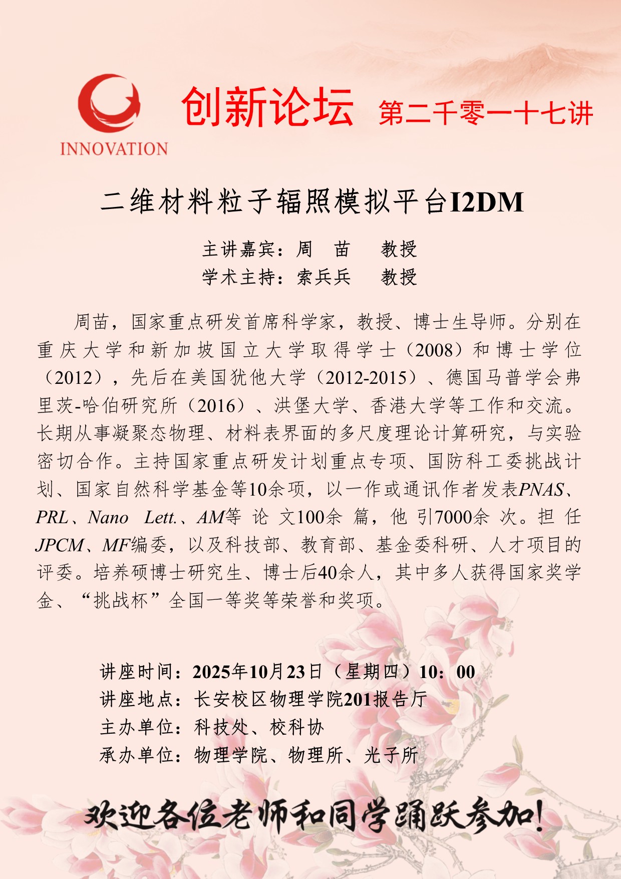 周苗 教授 星空app官网创新论坛第二千零一十七讲:二维材料粒子辐照模拟平台I2DM 讲座时间 2025年10月23日(星期四)10:00 讲座地点 长安校区物理学院201报告厅 讲座人介绍 周苗 教授 讲座内容