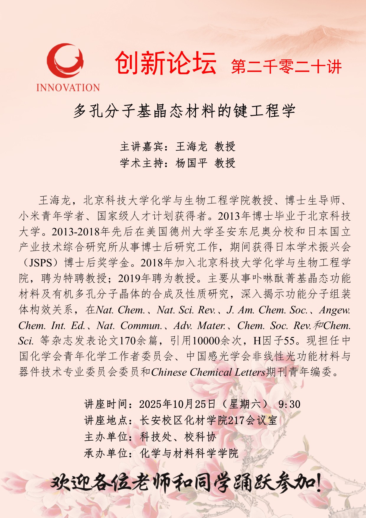 王海龙 教授 星空app官网创新论坛第二千零二十讲:多孔分子基晶态材料的键工程学 讲座时间 2025年10月25日(星期六) 9:30 讲座地点 长安校区化材学院217会议室 讲座人介绍 王海龙 教授 讲座内容
