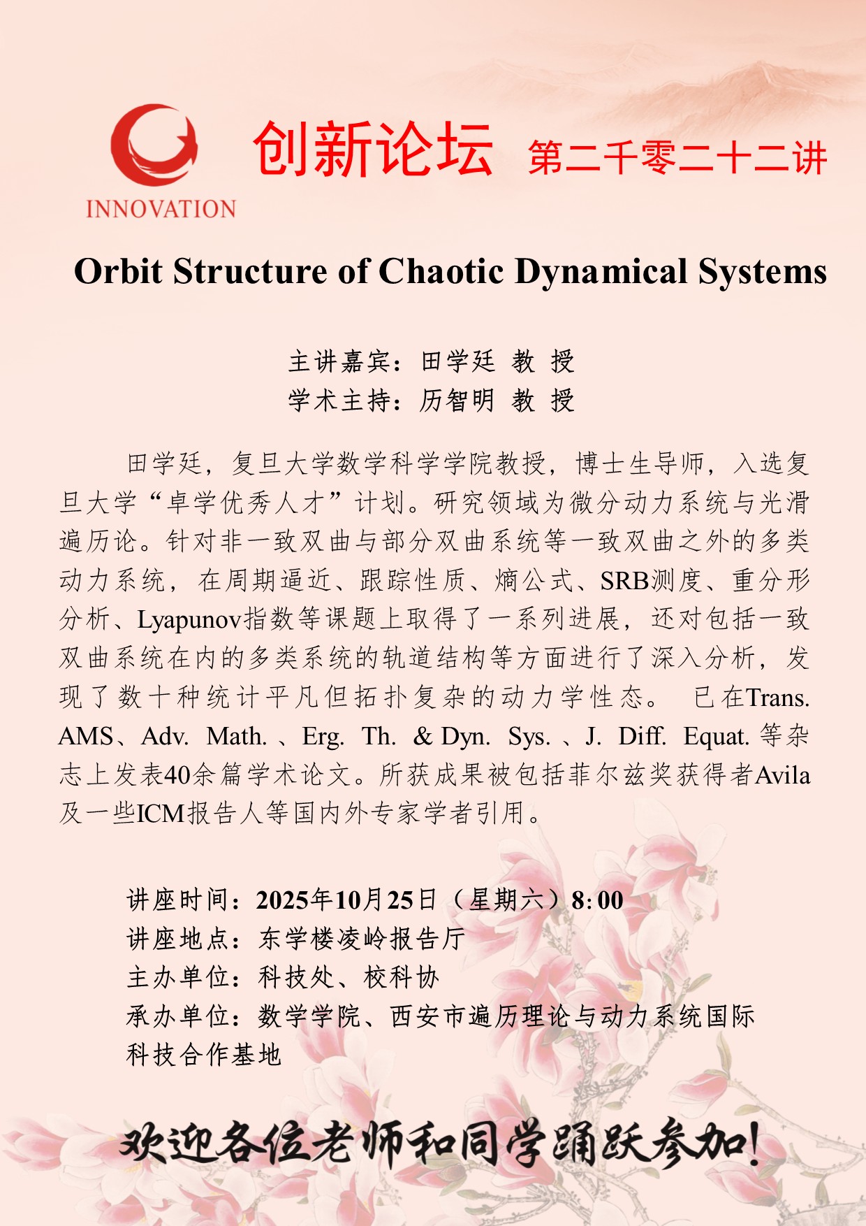 田学廷 教 授 星空app官网创新论坛第二千零二十二讲:Orbit Structure of Chaotic Dynamical Systems 讲座时间 2025年10月25日(星期六)8:00 讲座地点 东学楼凌岭报告厅 讲座人介绍 田学廷 教 授 讲座内容