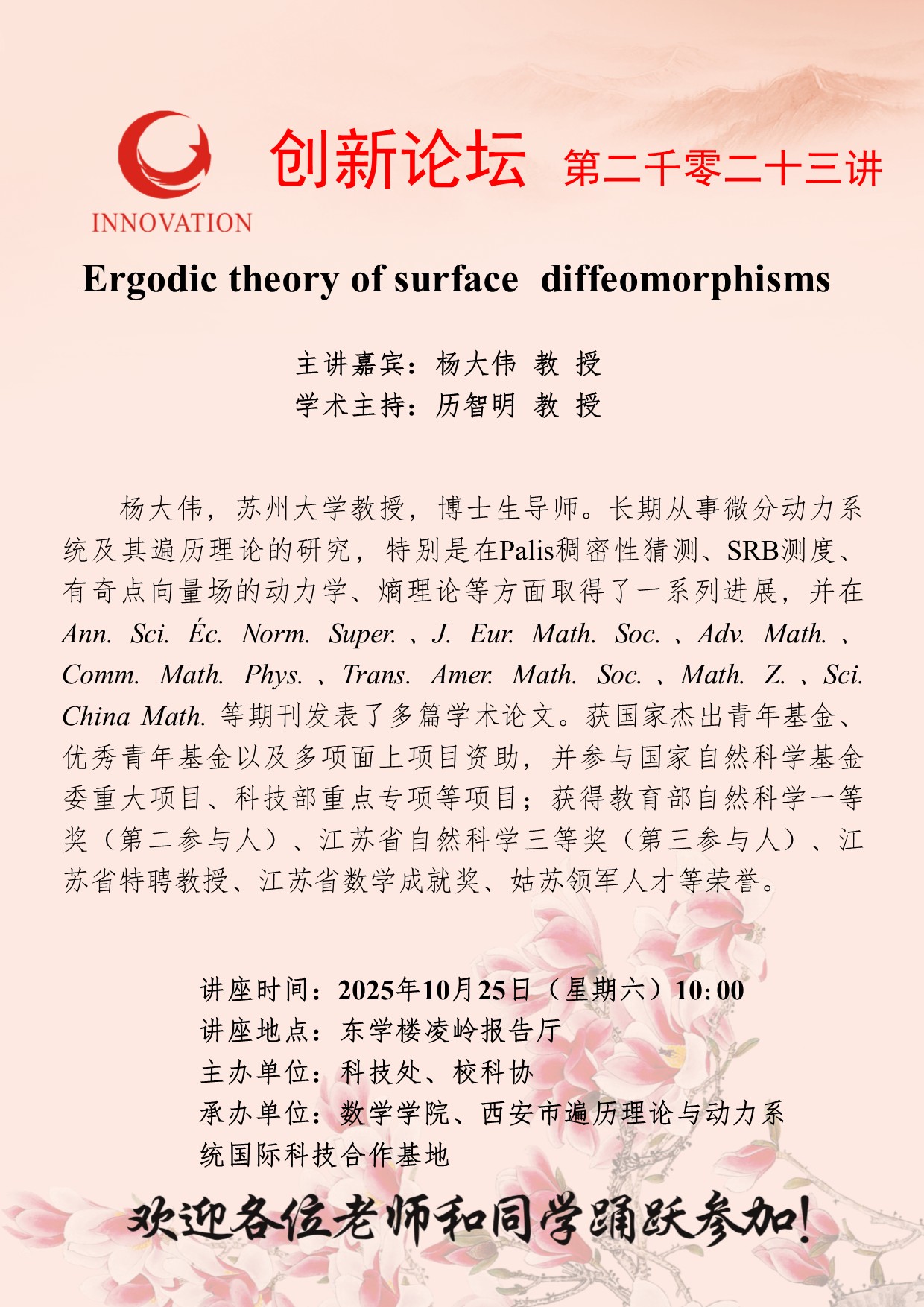 杨大伟 教 授 星空app官网创新论坛第二千零二十三讲:Ergodic theory of surface diffeomorphisms 讲座时间 2025年10月25日(星期六)10:00 讲座地点 东学楼凌岭报告厅 讲座人介绍 杨大伟 教 授 讲座内容