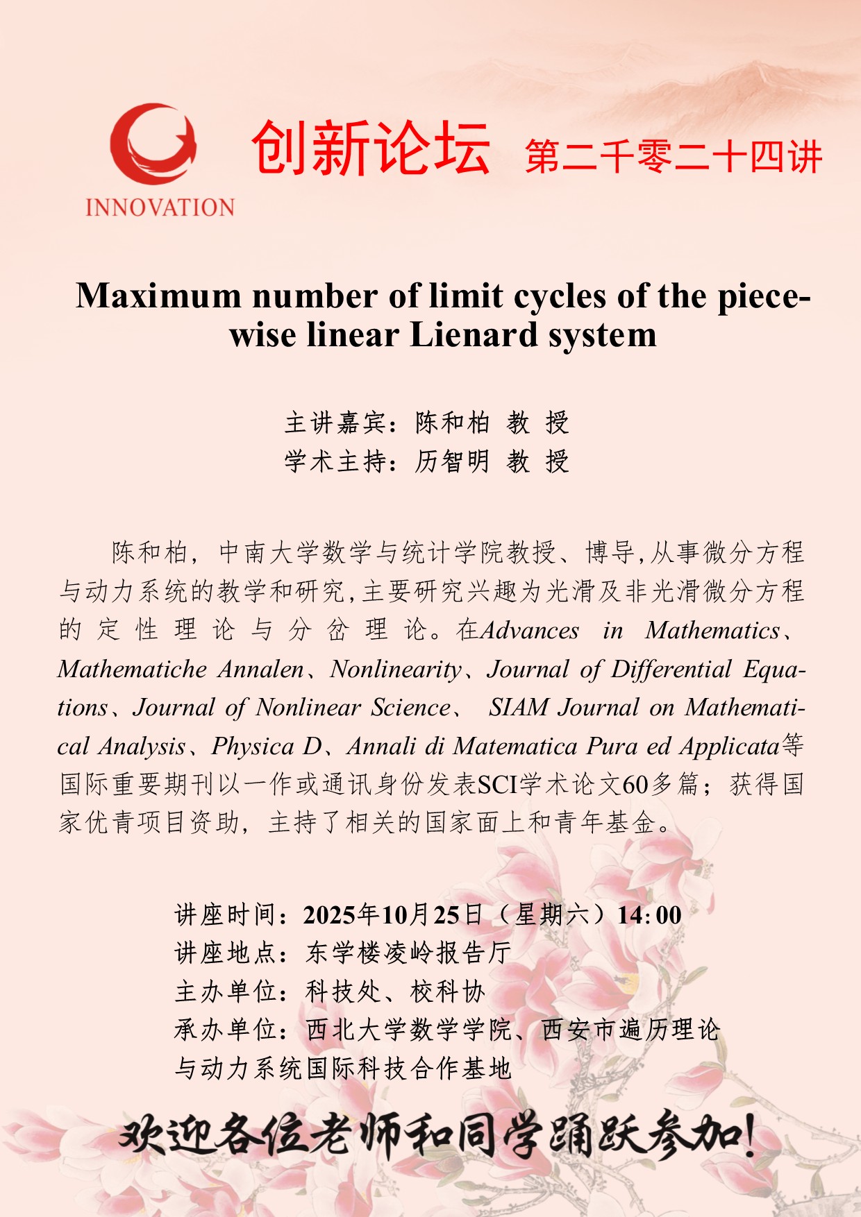陈和柏 教 授 星空app官网创新论坛第二千零二十四讲:Maximum number of limit cycles of the piecewise linear Lienard system 讲座时间 2025年10月25日(星期六)14:00 讲座地点 东学楼凌岭报告厅 讲座人介绍 陈和柏 教 授 讲座内容