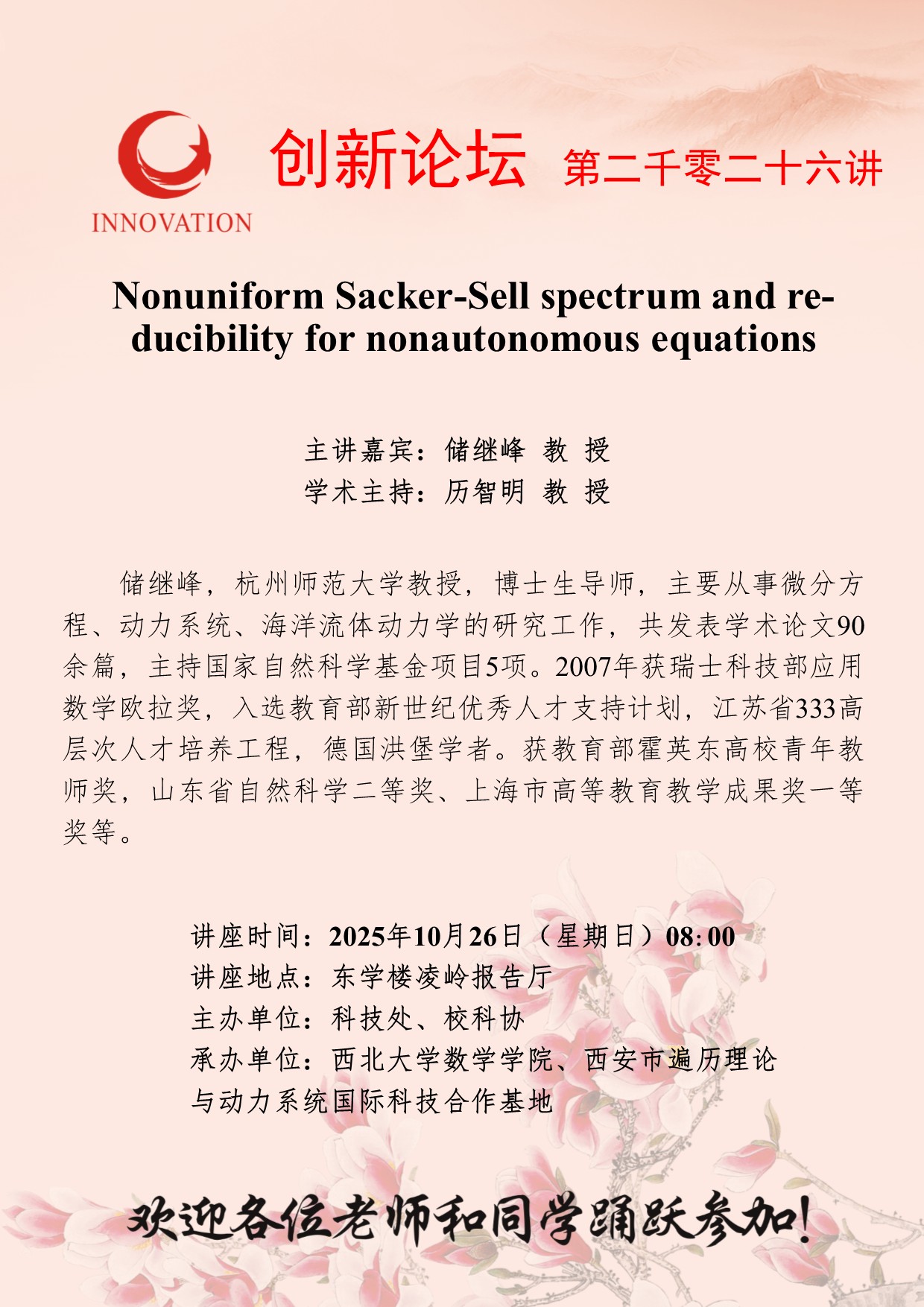储继峰 教 授 星空app官网创新论坛第二千零二十六讲:Nonuniform Sacker-Sell spectrum and reducibility for nonautonomous equations 讲座时间 2025年10月26日(星期日)08:00 讲座地点 东学楼凌岭报告厅 讲座人介绍 储继峰 教 授 讲座内容