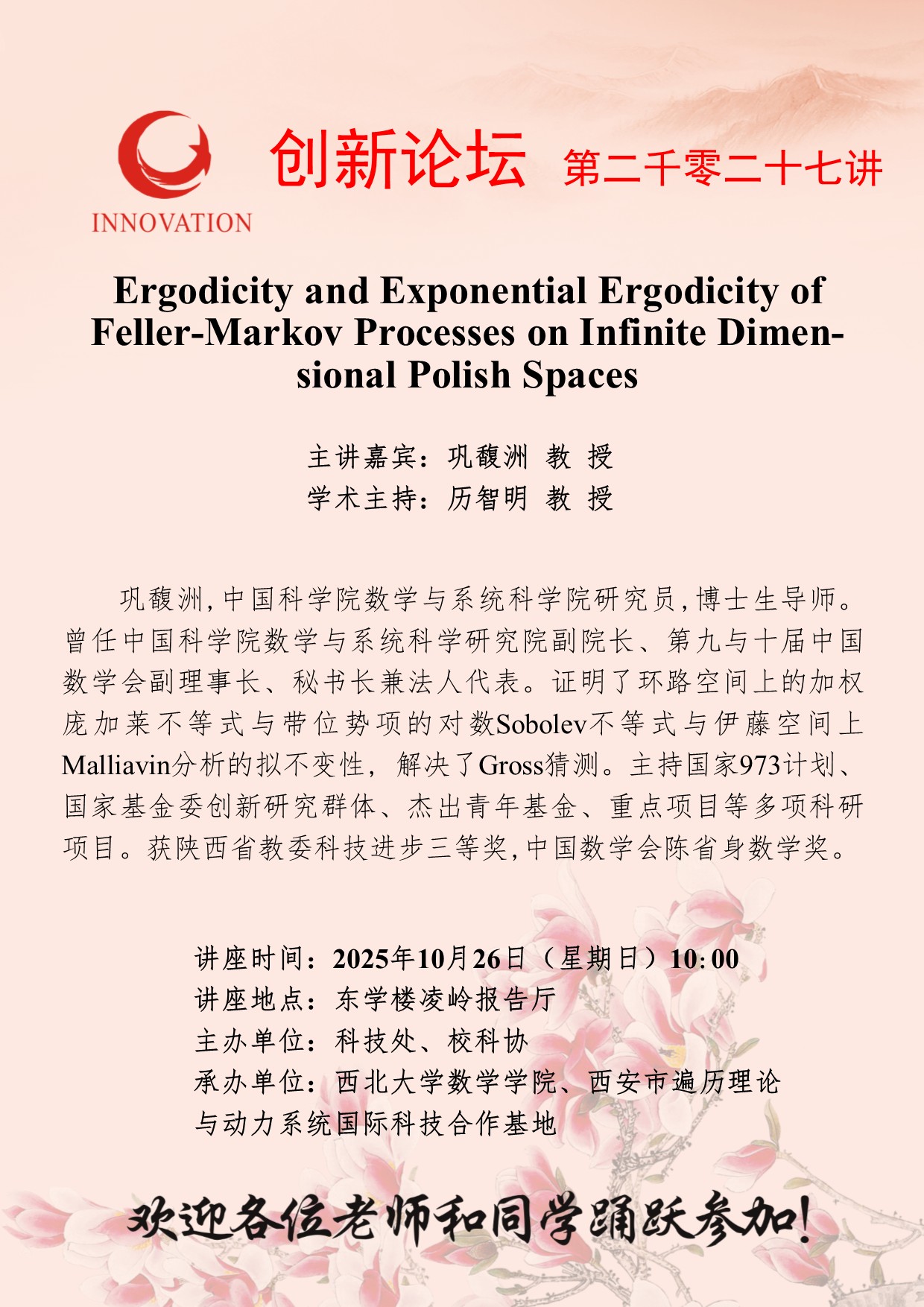 巩馥洲 教 授 星空app官网创新论坛第二千零二十七讲:Ergodicity and Exponential Ergodicity of Feller-Markov Processes on Infinite Dimensional Polish Spaces 讲座时间 2025年10月26日(星期日)10:00 讲座地点 东学楼凌岭报告厅 讲座人介绍 巩馥洲 教 授 讲座内容