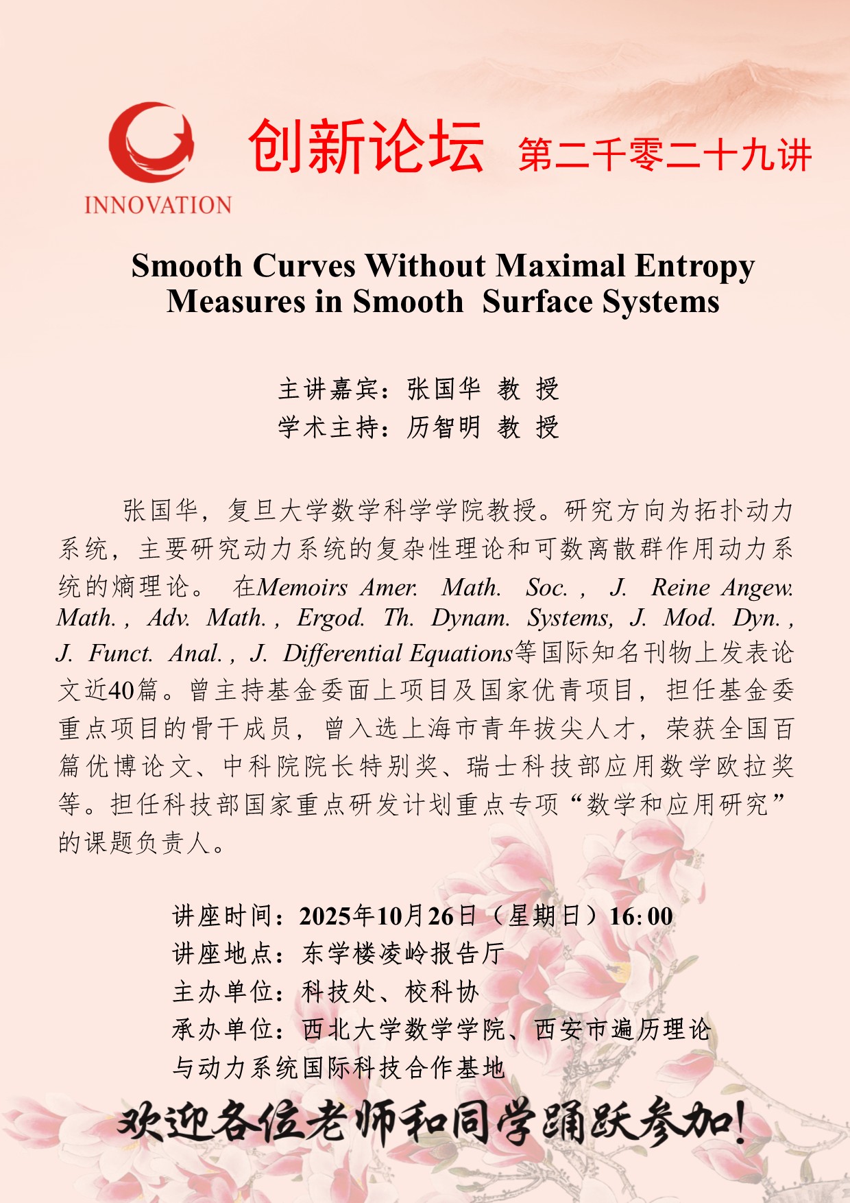 张国华 教 授 星空app官网创新论坛第二千零二十九讲:Smooth Curves Without Maximal Entropy Measures in Smooth Surface Systems 讲座时间 2025年10月26日(星期日)16:00 讲座地点 东学楼凌岭报告厅 讲座人介绍 张国华 教 授 讲座内容