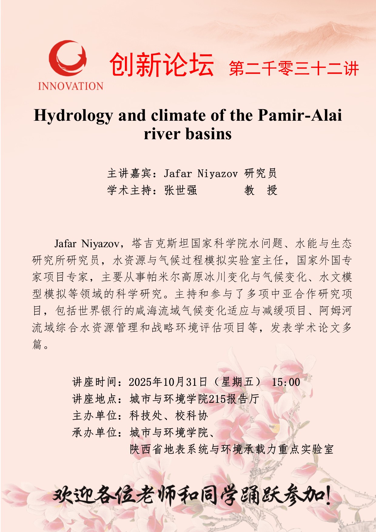 Jafar Niyazov 研究员 星空app官网创新论坛第二千零三十二讲:Hydrology and climate of the Pamir-Alai river basins 讲座时间 2025年10月31日(星期五) 15:00 讲座地点 城市与环境学院215报告厅 讲座人介绍 Jafar Niyazov 研究员 讲座内容