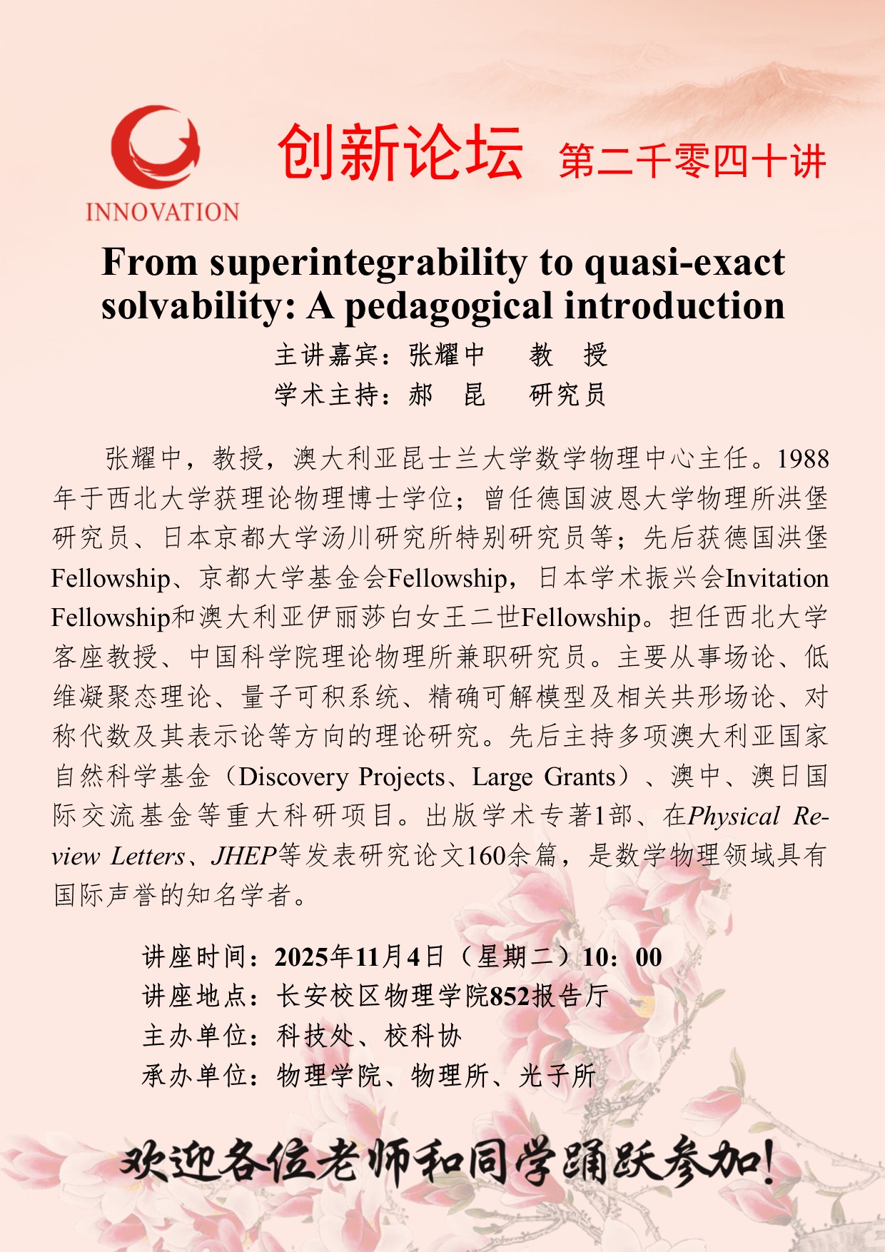 张耀中 教授 星空app官网创新论坛第二千零四十讲:From superintegrability to quasi-exact solvability: A pedagogical introduction 讲座时间 2025年11月4日(星期二)10:00 讲座地点 长安校区物理学院852报告厅 讲座人介绍 张耀中 教授 讲座内容