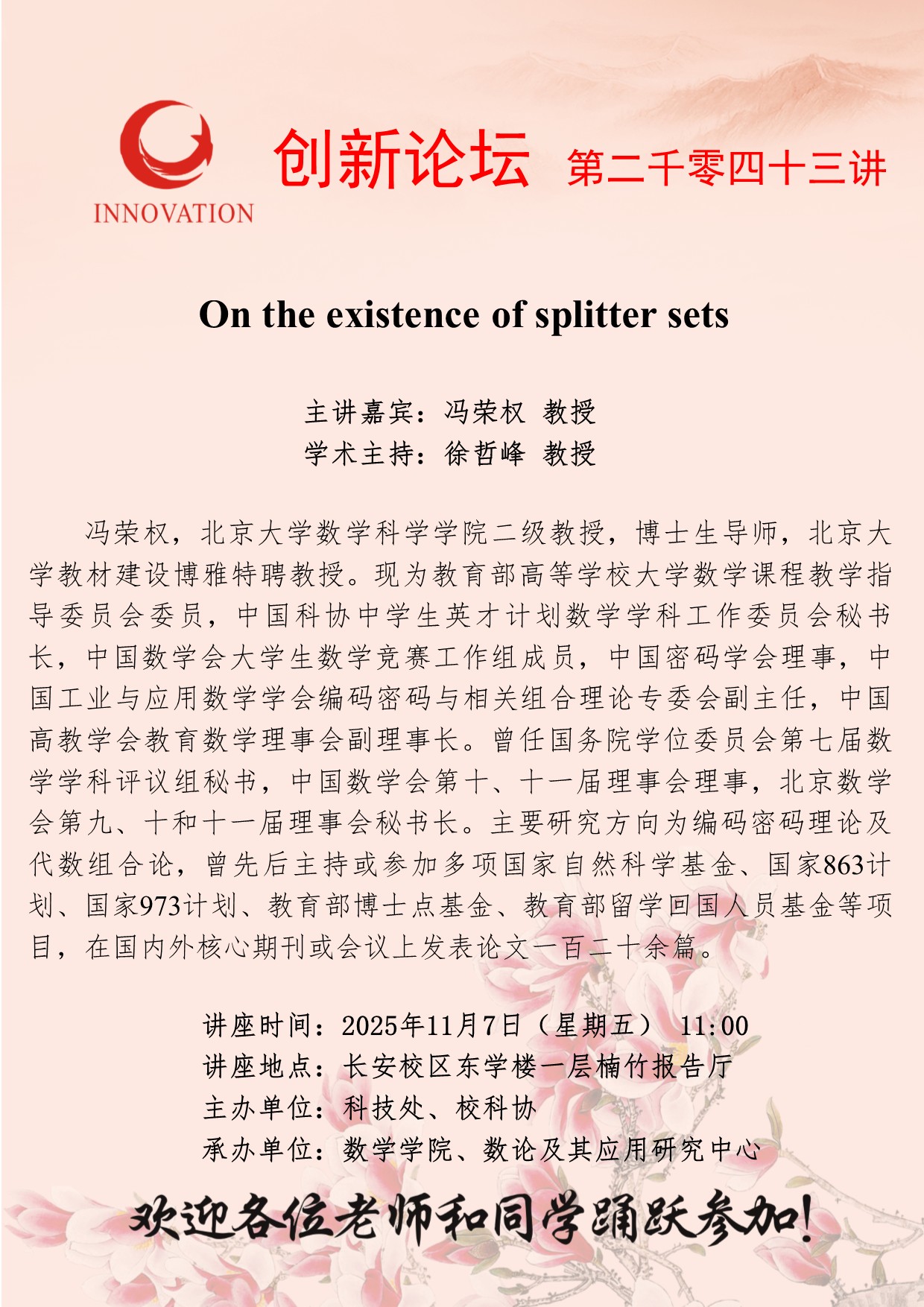 冯荣权 教授 星空app官网创新论坛第二千零四十三讲:On the existence of splitter sets 讲座时间 2025年11月7日(星期五) 11:00 讲座地点 长安校区东学楼一层楠竹报告厅 讲座人介绍 冯荣权 教授 讲座内容