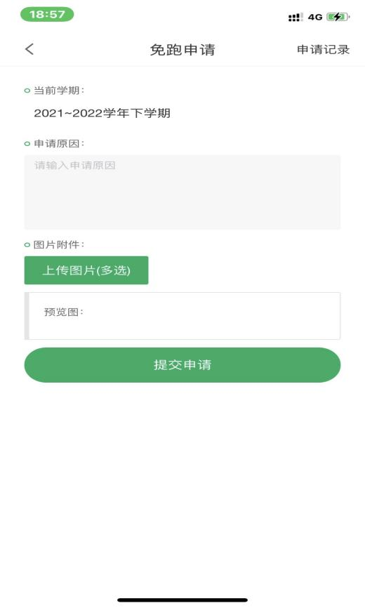 感染新冠病毒未能康复者,在步道乐跑APP端提交免跑申请。申请免跑原因填写为:感染新冠病毒未能康复,特申请免跑。同时将免跑申请纸质版本人签名后上传。康复后到体育教研部教务室(联系人:王老师,联系电话:88308757)办理复跑手续。操作如下: